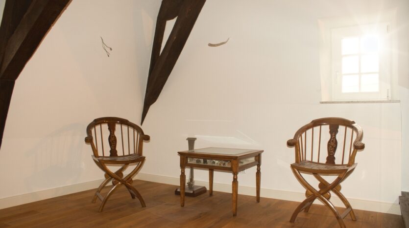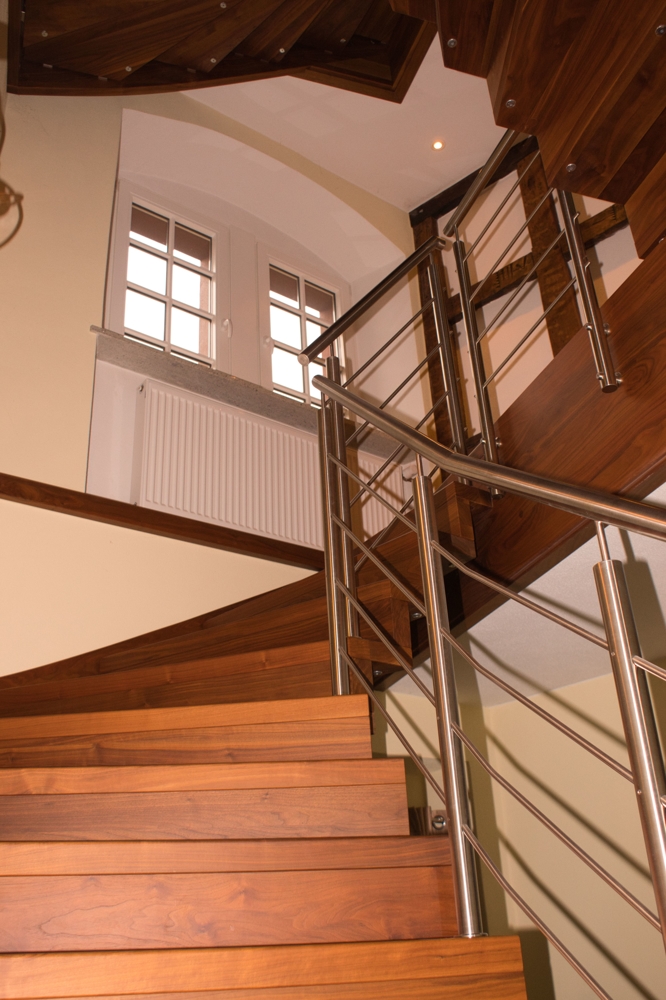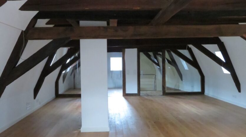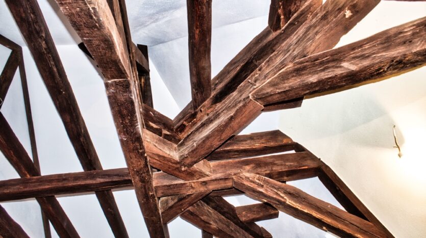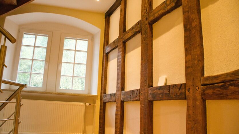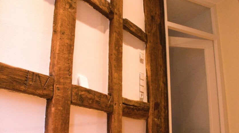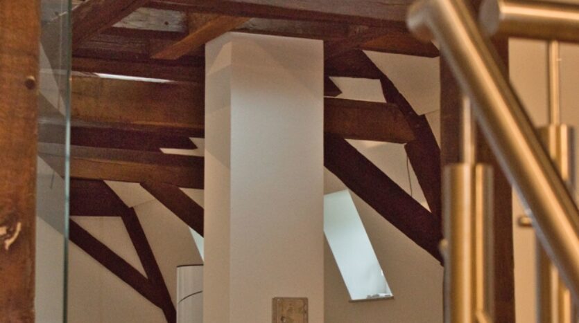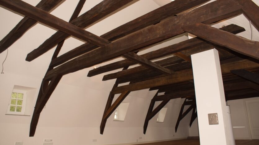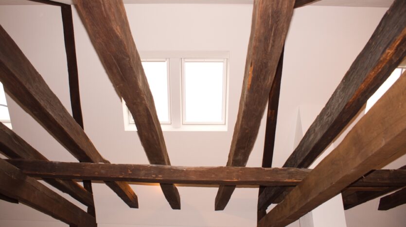 Das Innere des Gebäudes wurde komplett neu aufgebaut und erhaltenswürdiges Gebälk freigelegt.