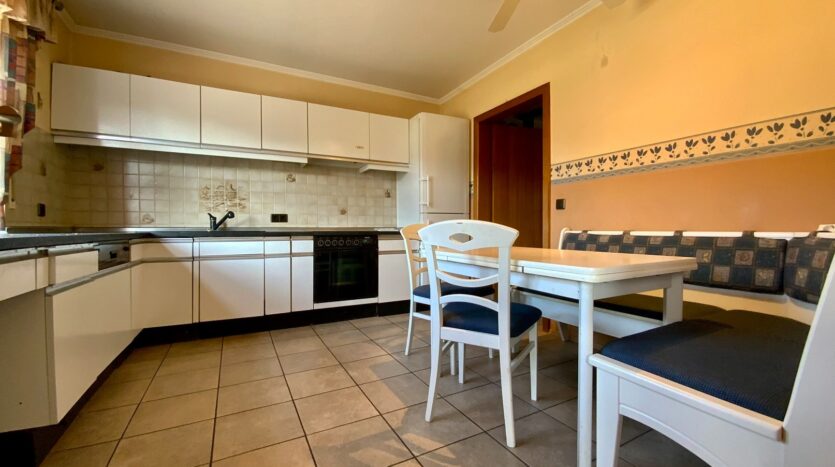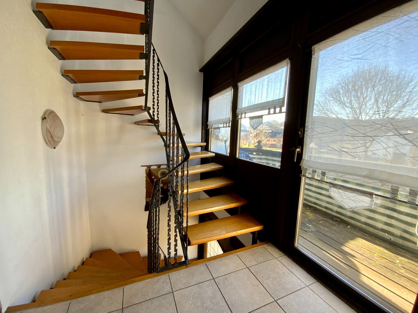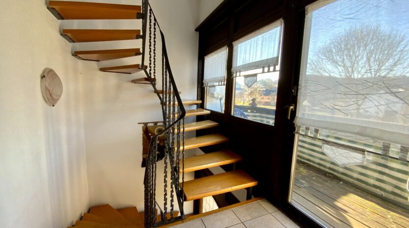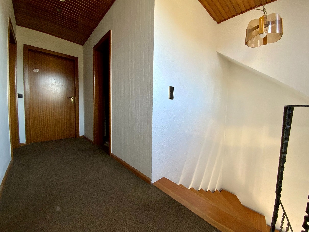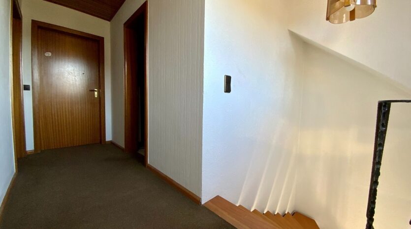 Eine massive Treppe führt zum Obergeschoss. Das Obergeschoss teilt sich auf in den gefliesten Flur, Gästetoilette, Abstellraum, eine Küche incl. Einbauküche, ein großes Wohnzimmer mit Balkon und Zugang zur befestigten Terrasse.