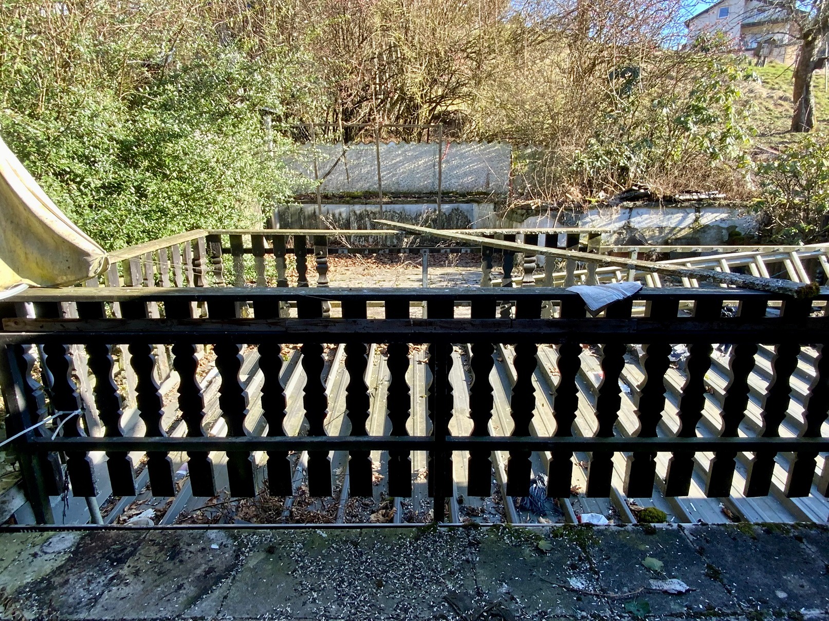 Über eine Türe am Ende des Flures befindet sich eine Überdachung wo sich aktuell eine Werkstatt befindet. Die Überdachung ist in einem schlechten Zustand.