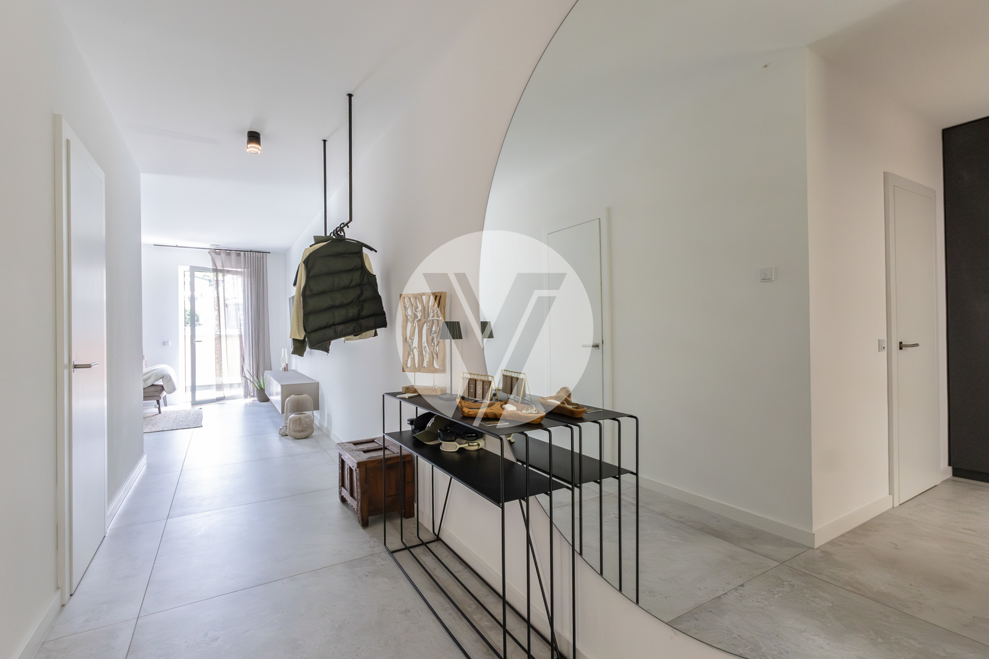 De open woon- en eetkamer creëert een lichte sfeer en biedt directe toegang tot het ruime dakterras – een waar hoogtepunt dat uitnodigt tot ontspannen, zonnebaden of gezellige avonden buiten.