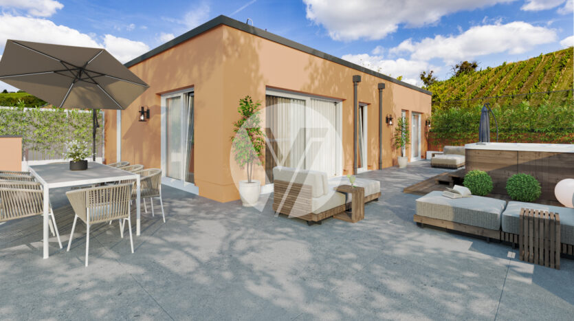 Der offen gestaltete Wohn- und Essbereich schafft eine lichtdurchflutete Atmosphäre und bietet direkten Zugang zur großzügigen Dachterrasse – ein echtes Highlight, das zum Entspannen, Sonnen oder geselligen Abenden unter freiem Himmel einlädt.