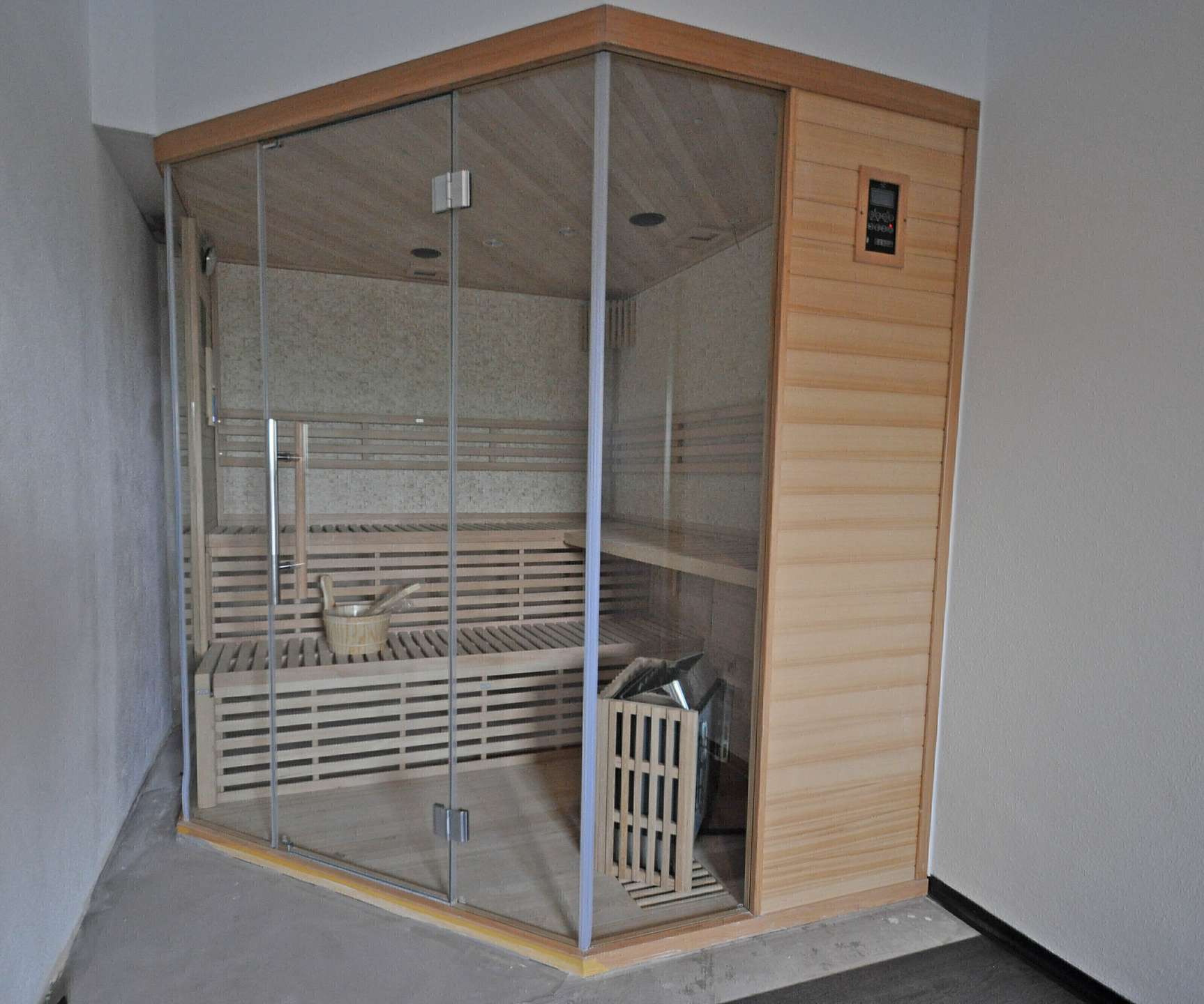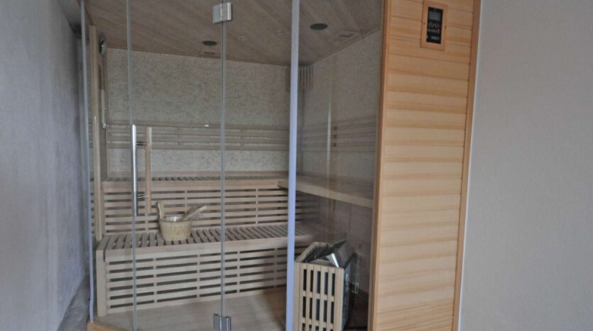 Ein separates Gäste-WC, der stilvolle Saunabereich mit eigenem Duschbad und direktem Zugang zur Terrasse, mehrere Abstellräume sowie der Technikraum runden das Untergeschoss ab.