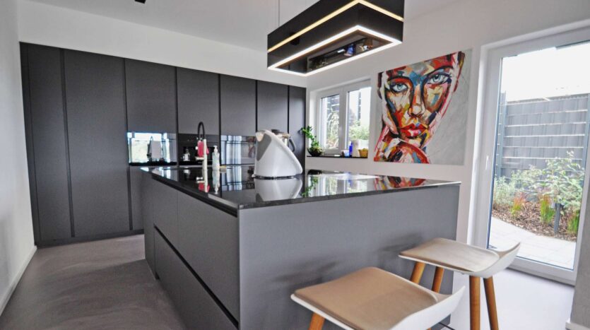 Besonderes Highlight: Der integrierte Weinkühler in der Wand sowie die luxuriöse Designerküche (NP ca. 68.000 €) mit Kaffeevollautomat, Dampfgarer, Teppanyaki-Grill und großzügiger Kochinsel – bereits im Kaufpreis enthalten.