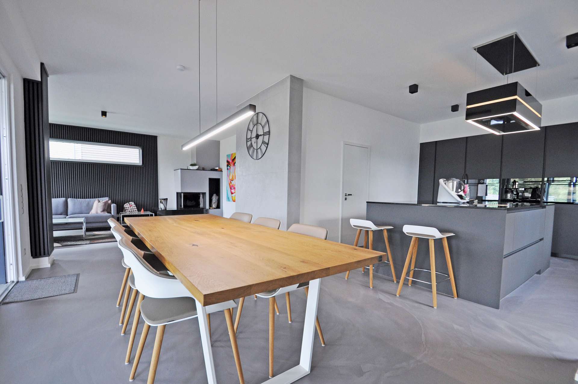 Das Herzstück des Hauses ist der offen gestaltete Wohn-, Ess- und Küchenbereich mit Blick in den idyllischen Garten. Genießen Sie gesellige Abende vor dem Kamin oder laue Sommertage auf der überdachten Terrasse am exklusiven Salzwasserpool.