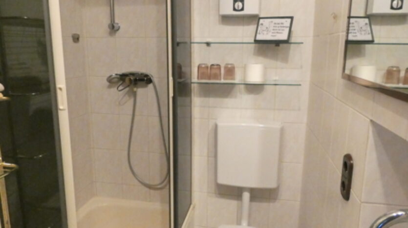 Vier Treppenstufen höher befindet sich das Badezimmer (Dusche, WC), welches über den Flur erreicht wird.