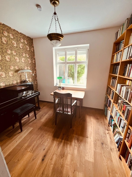 Das Erdgeschoss betritt man über den 2022 angebauten Eingangsbereich, der durch seine Größe als Wintergarten genutzt werden kann. Von dort gelangt man in die Küche samt Sitzbereich sowie in ein weiteres Zimmer.