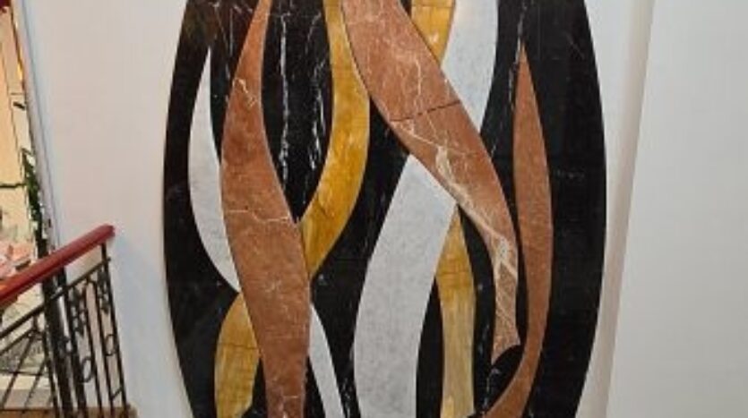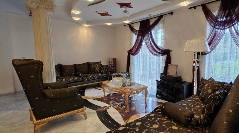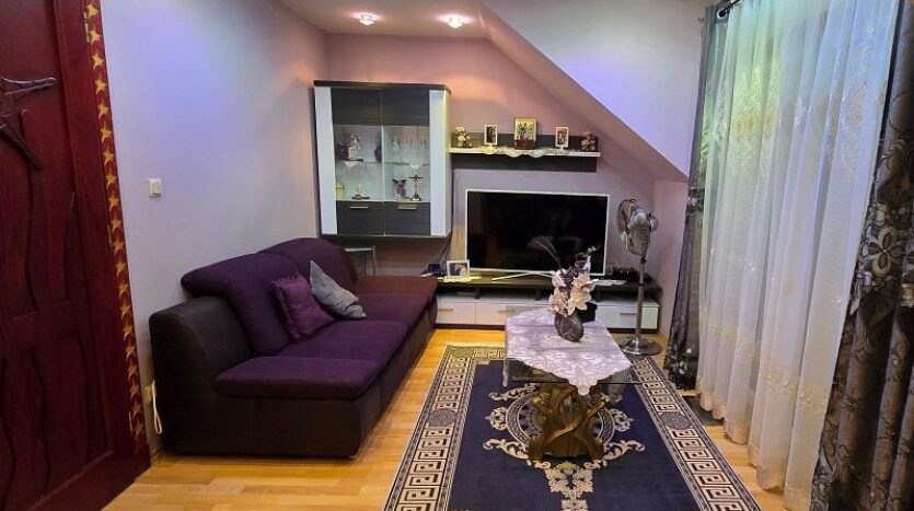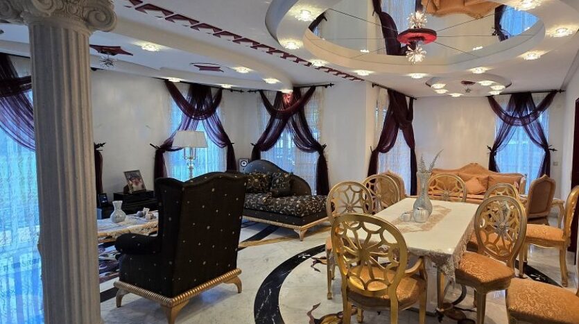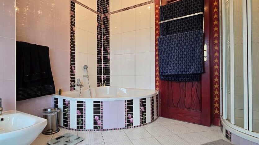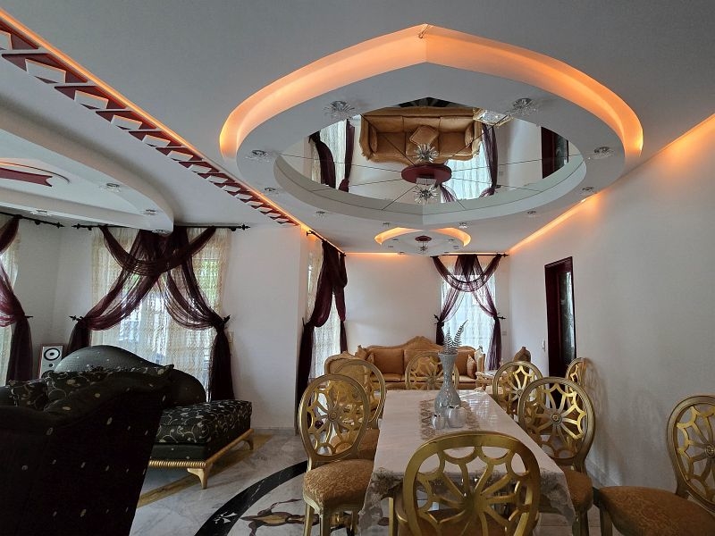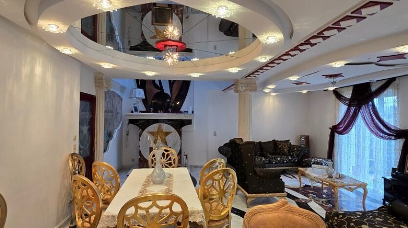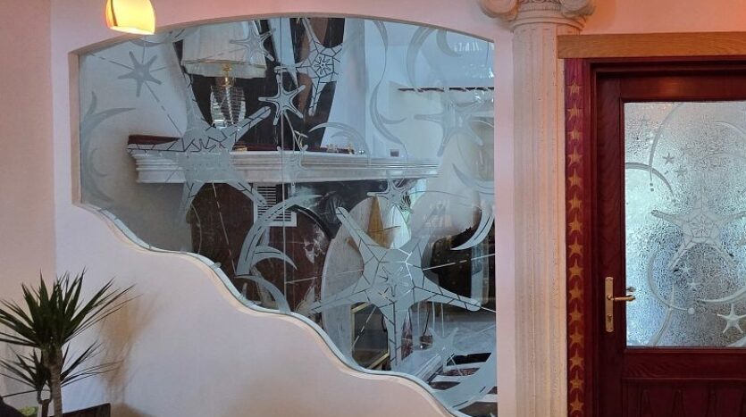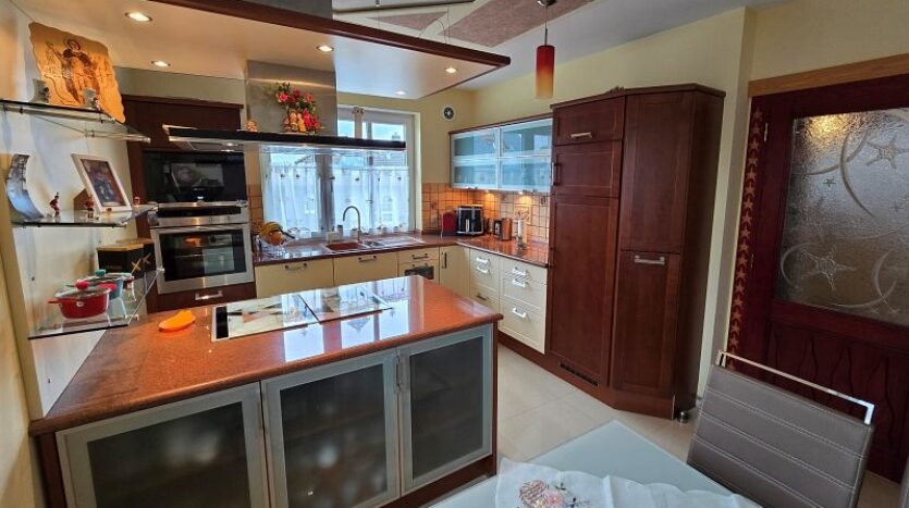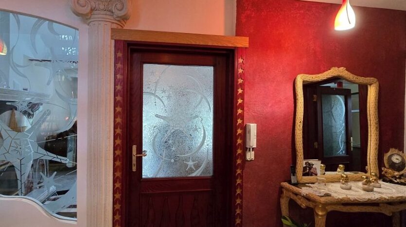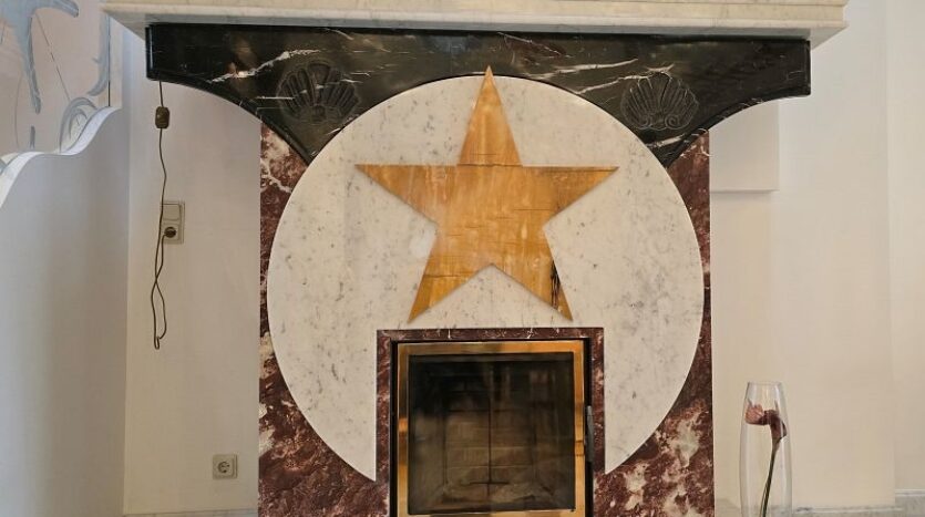 Een plafondgedeelte met een kleine galerij verbindt de begane grond met de bovenverdieping. De stijlvolle open haard met marmeren bekleding, die zich over twee verdiepingen uitstrekt, lijkt op een vlammende vlam. Alle deuren, inclusief deurkozijnen en een deel van de beglazing, zijn op maat gemaakt.