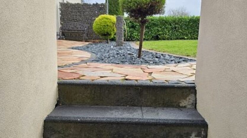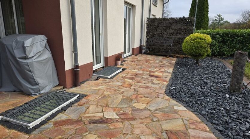 Die Außenterrasse im Bereich des Wohn- und Esszimmers ist durch den darüberliegenden Balkon teilüberdacht. Das ebenerdige Gartengrundstück ist sehr liebevoll und hübsch angelegt. Durch die Randlage genießt das Grundstück enorm viel Ruhe und Privatsphäre.
