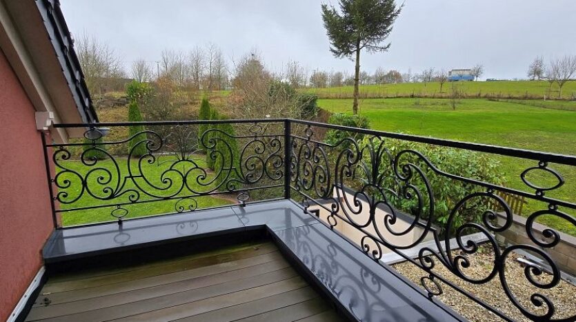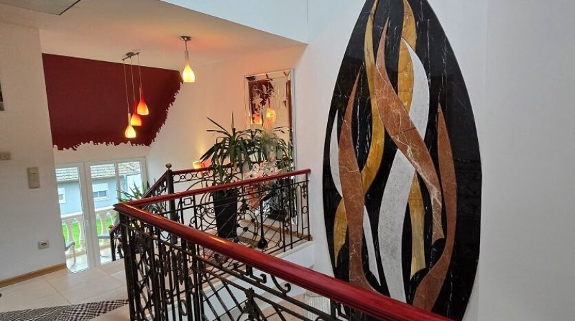 Über eine Holztreppe mit Ambientebeleuchtung im Bereich der Stufen gelangt man in das Obergeschoss. Die Galerie verleiht dem gesamten Wohnhaus ein außerordentlich modernes und offenes Erscheinungsbild. Auf halber Etage zum Obergeschoss befindet sich ein kleiner überdachter Freisitz/Balkon mit prächtigem Außengeländer.