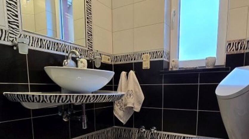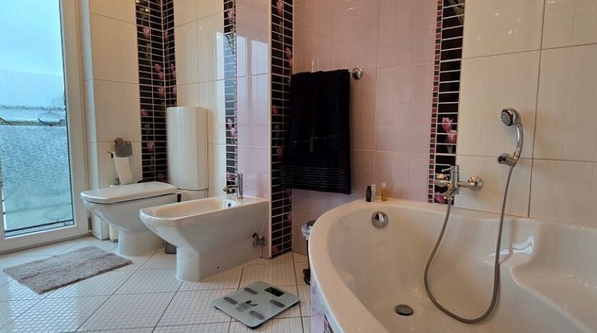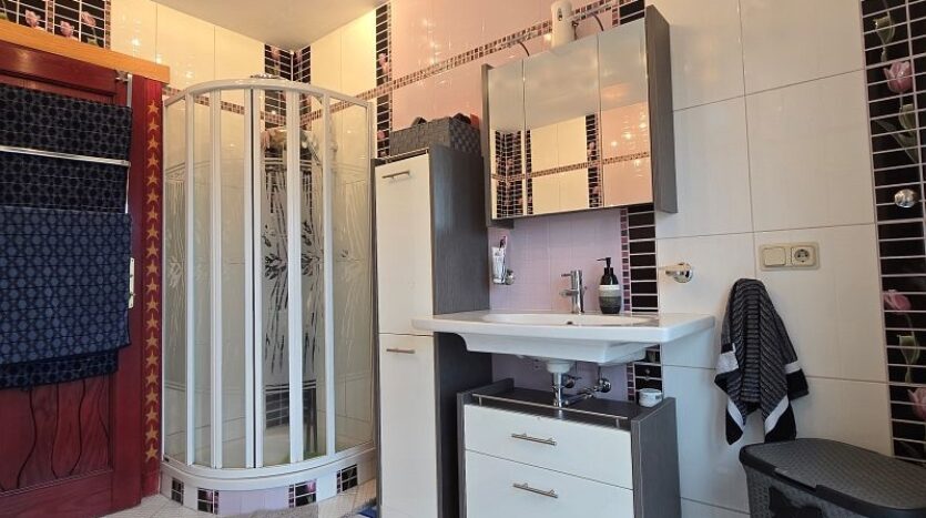 Im Obergeschoss stehen drei geräumige Schlafzimmer (ein Schlafzimmer mit Balkon) und ein Badezimmer zur Verfügung. Auch das hochwertige Bad im Obergeschoss setzt in Ausführung und Farbgestaltung hübsche Akzente.