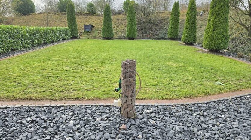 Neben dem Wohnhaus befindet sich eine große Garage. Eine Nebentür führt von der Garage aus auf das Grundstück und die Grünfläche hinter dem Wohnhaus.