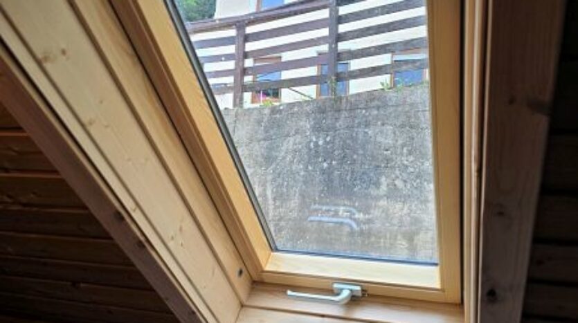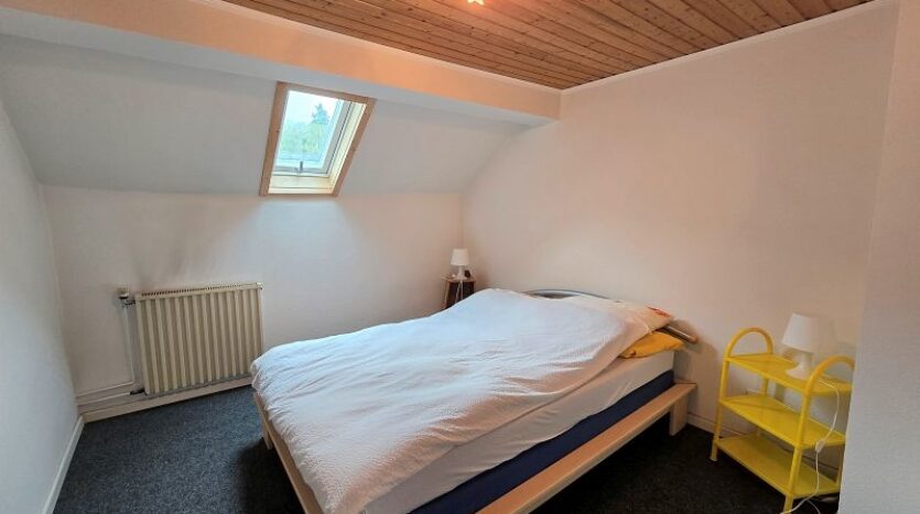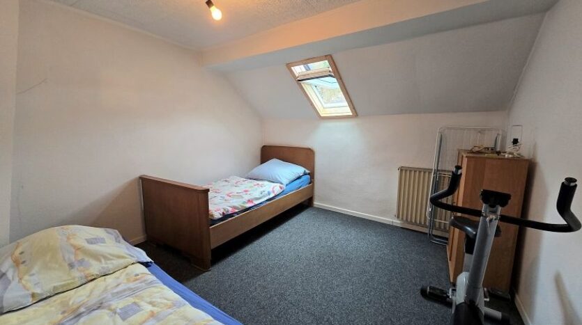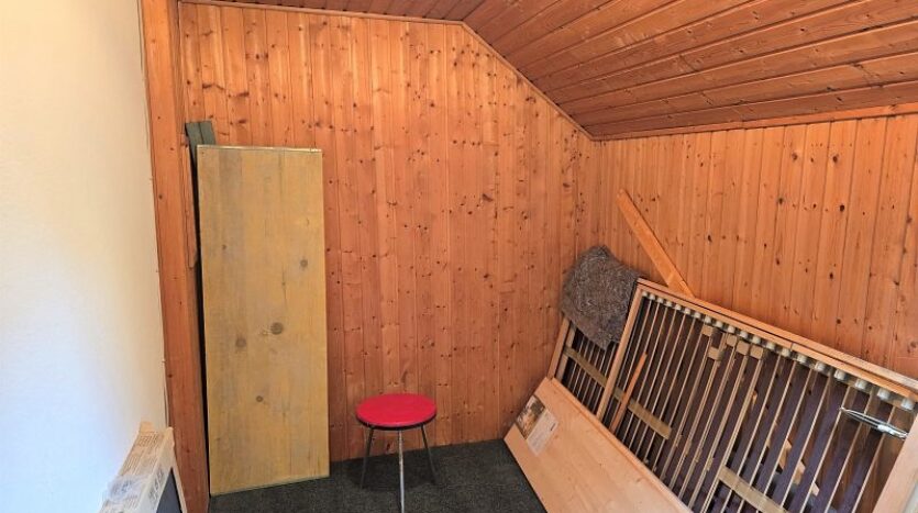 Eine weitere Holztreppe führt zum Dachgeschoss. Das Dachgeschoss verfügt über zwei Schlafzimmer und eine Abstellfläche im Bereich des Treppenhauses.