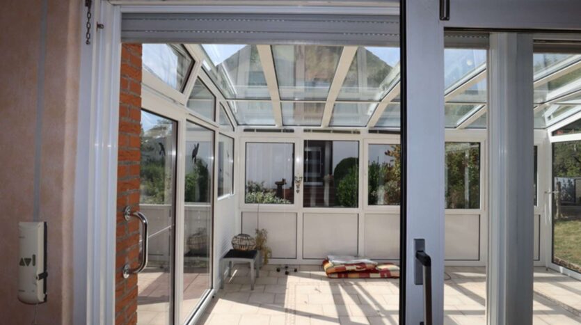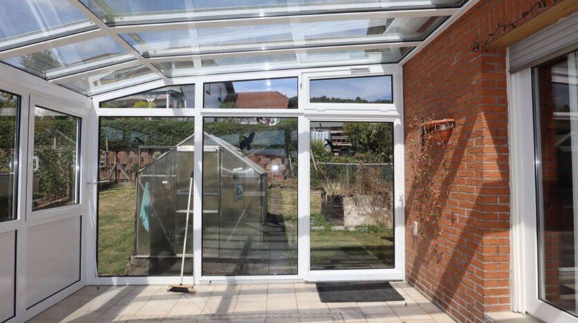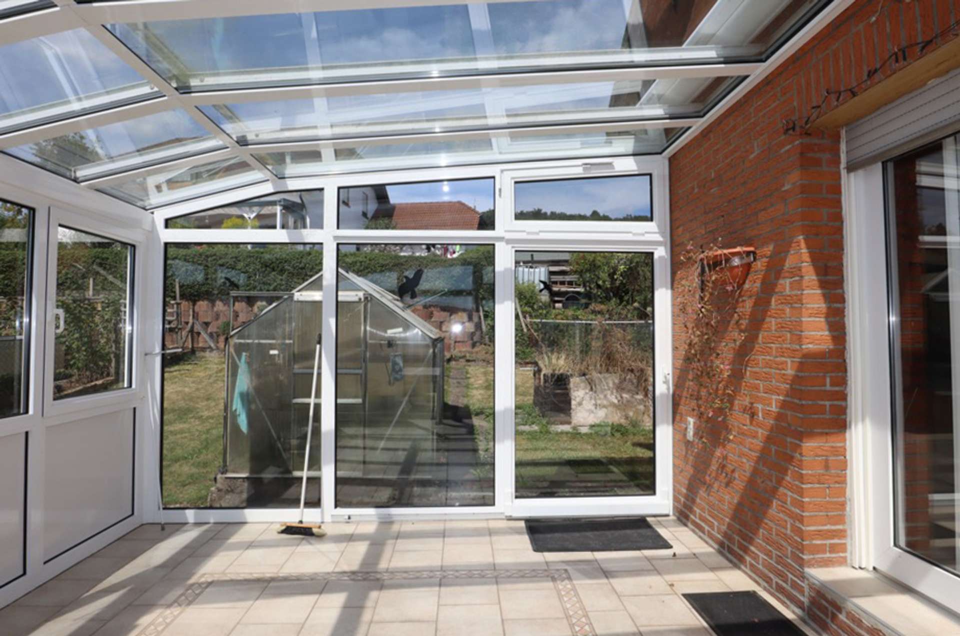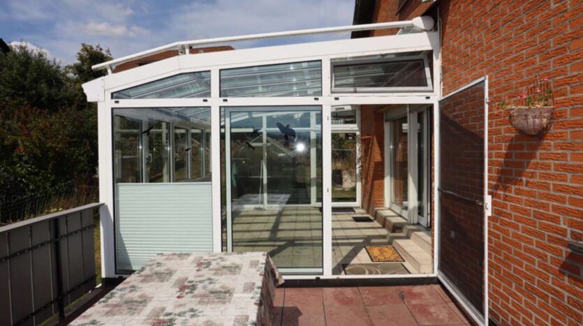 Die Wohnfläche beträgt ca.184 m². Im Erdgeschoss befindet sich eine kleine Wohnung mit Wohnzimmer, Küche, Bad mit barrierefreier Dusche und einem Schlafzimmer. Zudem befindet sich dort ein Kellerraum mit Zugang zur Garage und ein Hauswirtschaftsraum. Im Obergeschoss befindet sich die Hauptwohnung mit Wohnzimmer, Esszimmer, Küche, zwei Schlafzimmern, Bad, Gäste-WC. Das geräumige Wohnzimmer verfügt über einen Zugang zum Wintergarten und von hier betreten Sie die zusätzliche große Sonnenterrasse. Hier können Sie bei jedem Wetter Zeit draußen verbringen.