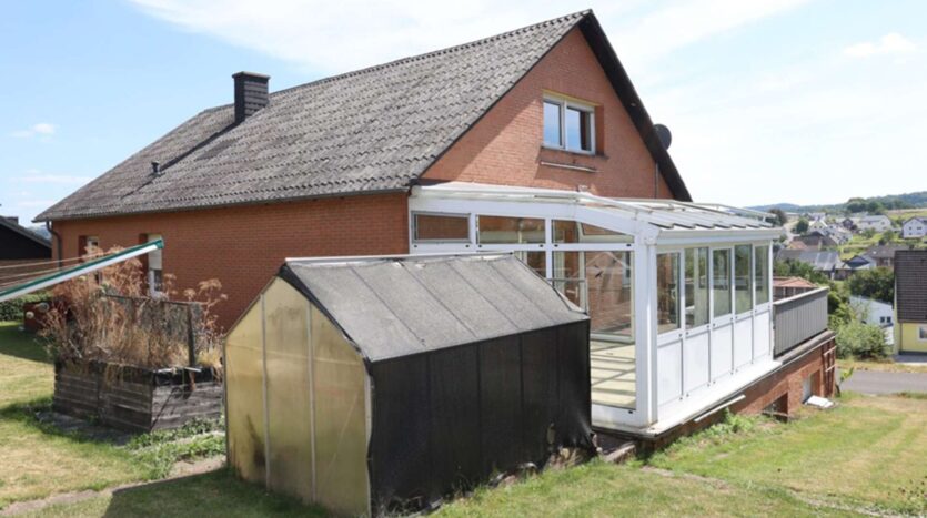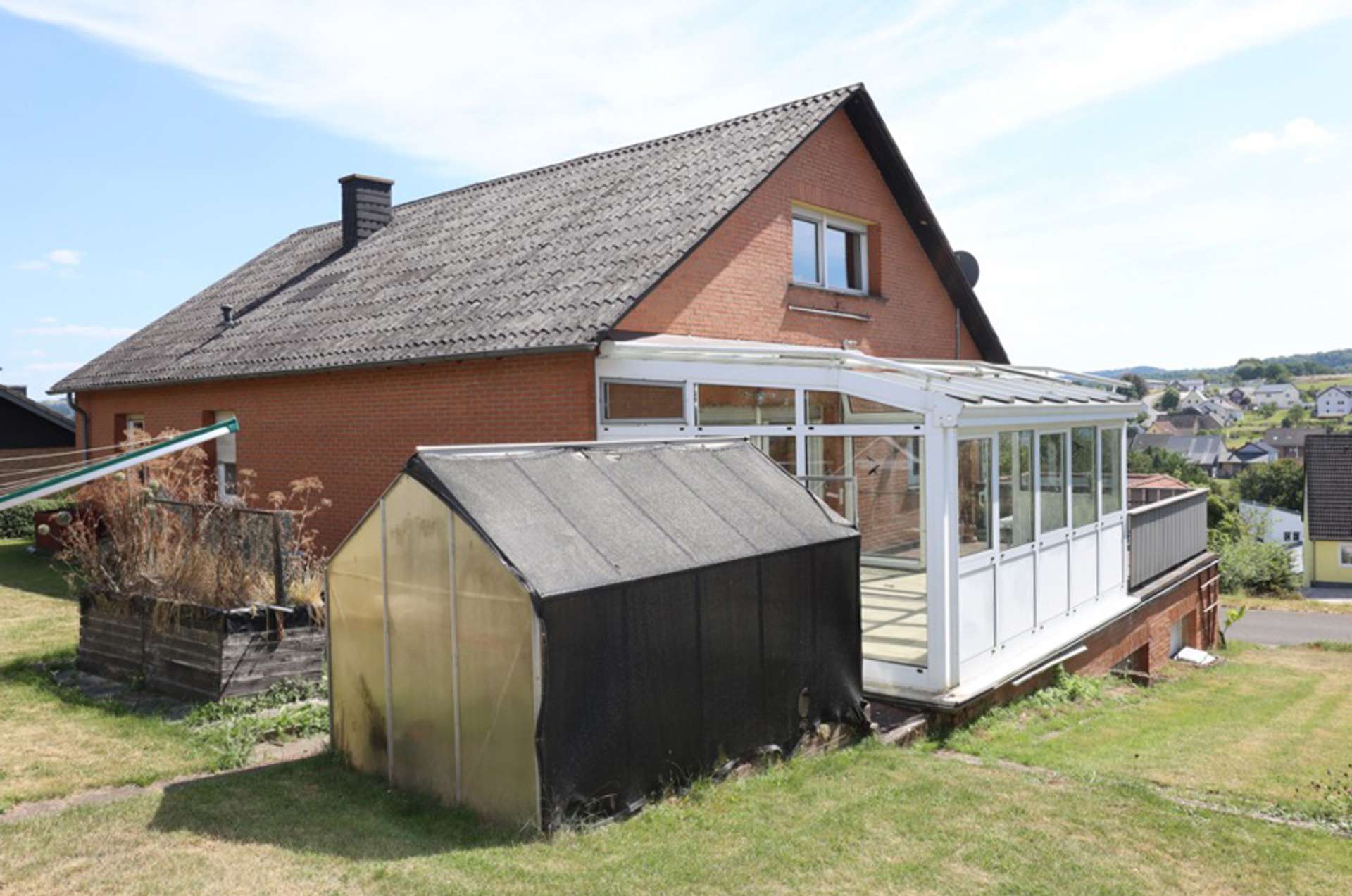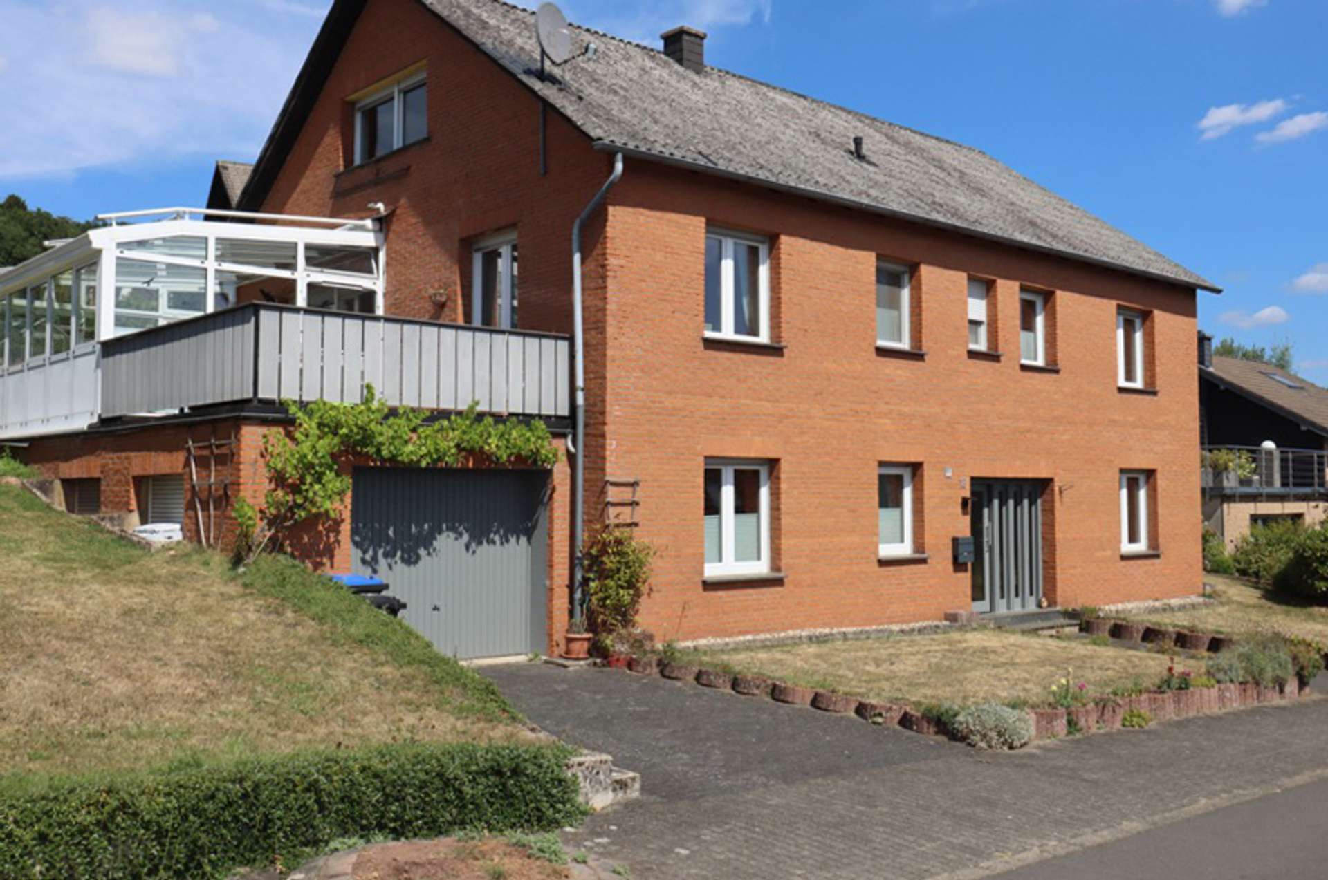 Vrijstaande woning met garage, veranda, prachtig uitzicht en tuin te koop in Oberbettingen nabij Hillesheim.