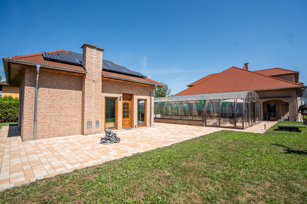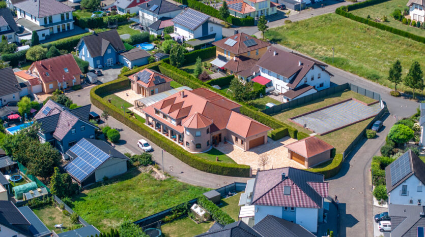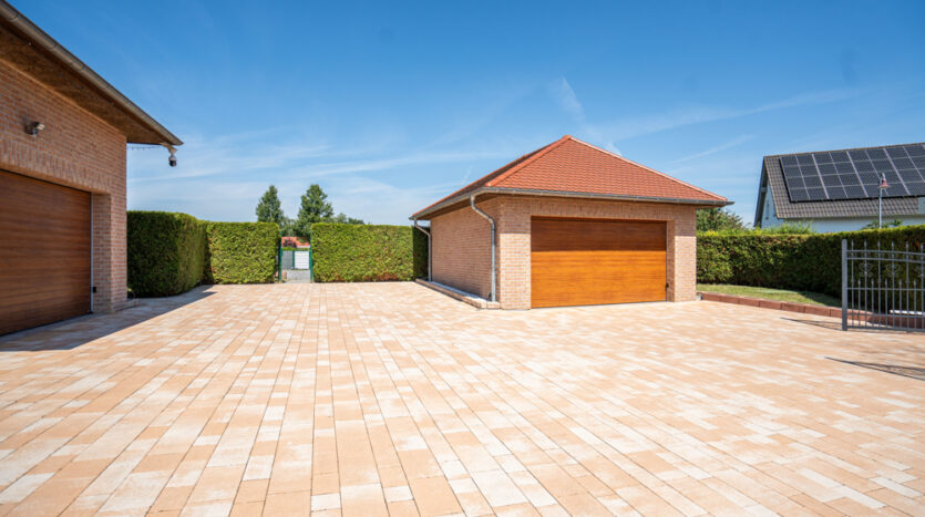 Der Gebäudekomplex besteht aus dem großzügigen Wohnhaus über zwei Etagen sowie zwei Doppelgaragen und dem massiv errichteten Poolhaus.