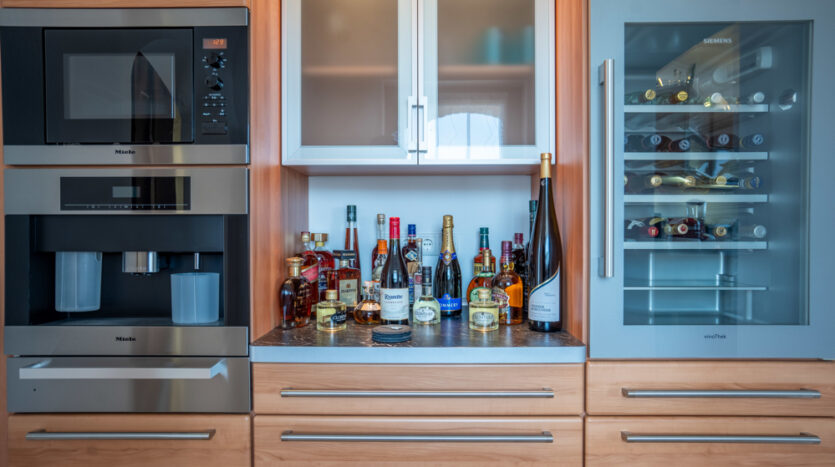 maßgefertigte, hochwertige Markeneinbauküche im Erdgeschoss des “Turmes” und genießen einen nahezu “Rundumblick”, während Sie hier Kochabende mit Ihrer Familie und Freunden verbringen. Für den Aperitif schließt sich hier im Durchgang zum Esszimmer eine kleine Getränkeküche mit Weinklimaschrank und Kaffeeautomat an.