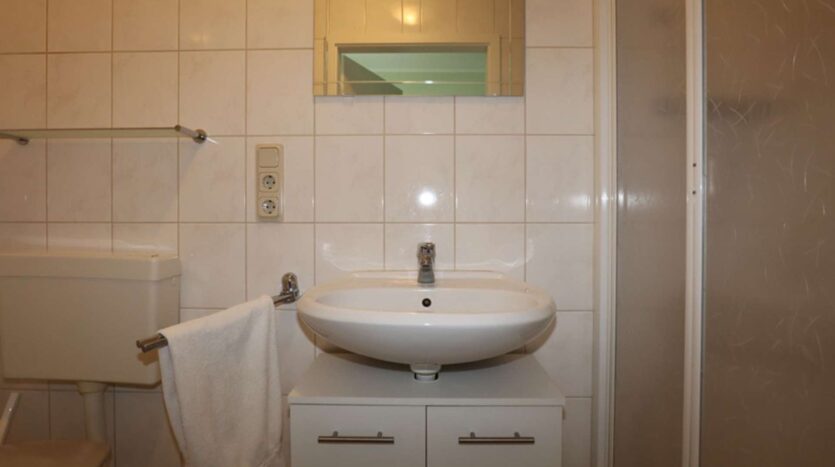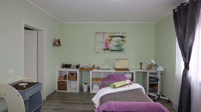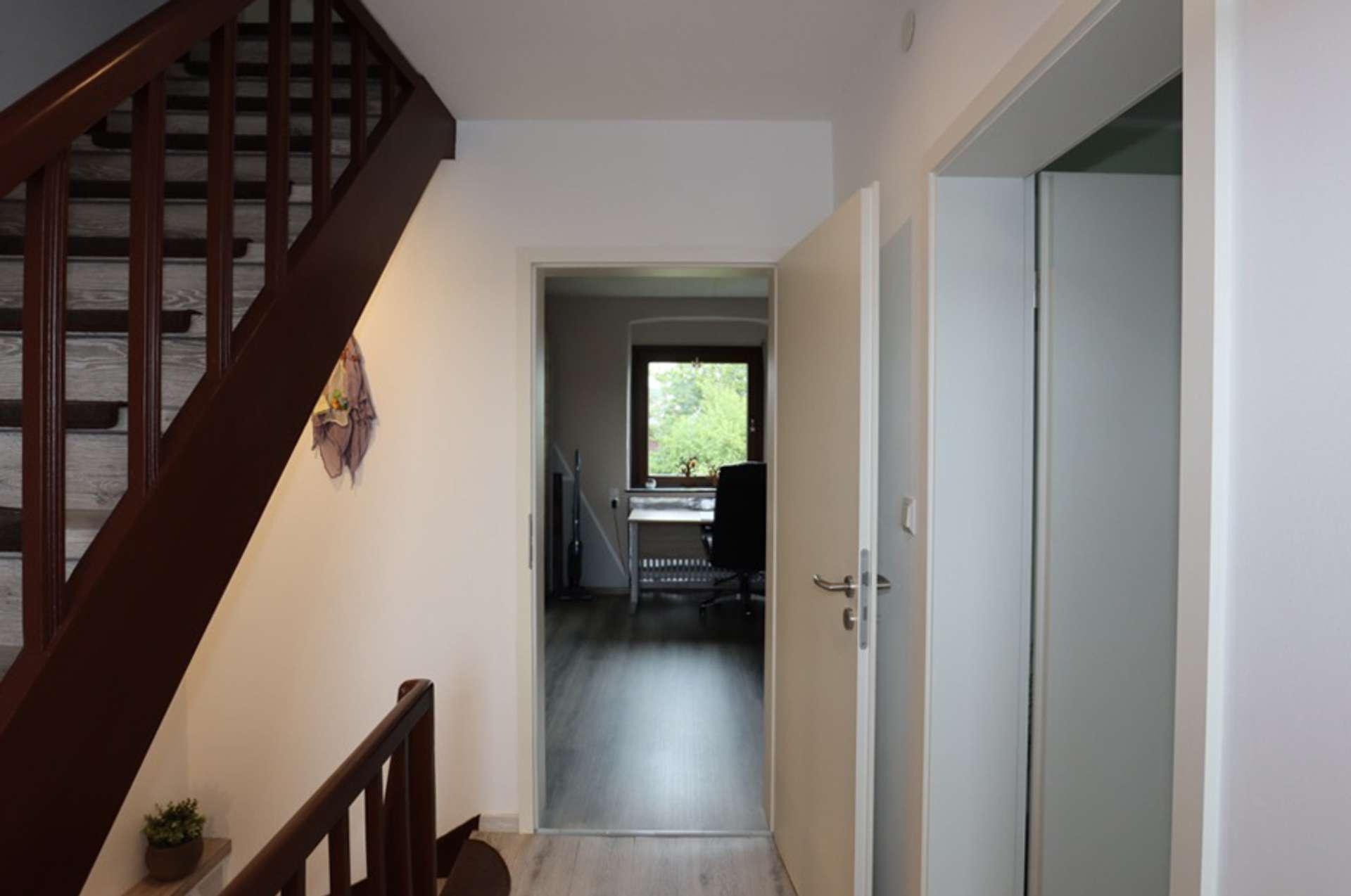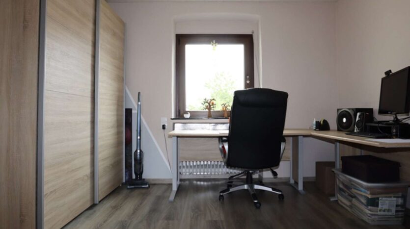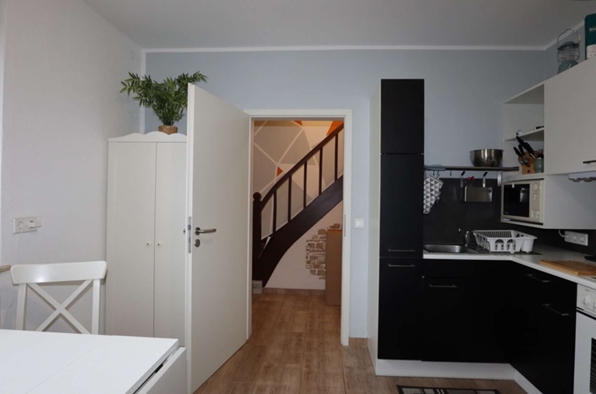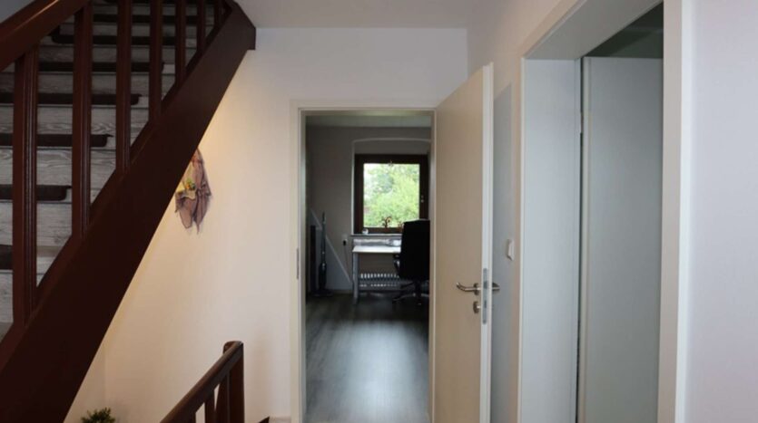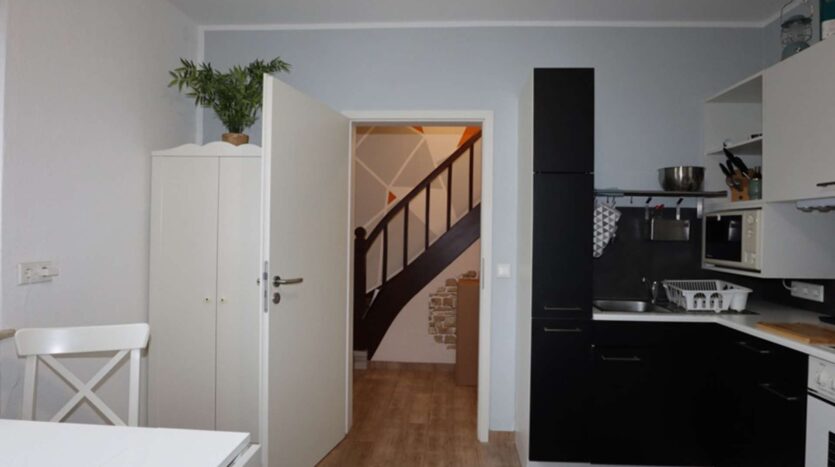 Auf der rechten Seite liegt das Ursprungsgebäude, in dem sich im Erdgeschoss die kleine Ferienwohnung befindet. Mit einem Schlafzimmer, einem kombinierten Wohn-/ Küchenraum, einem kleinen Abstellraum und einem Badezimmer ist das kleine Urlaubsglück perfekt. Die Treppe führt hinauf zu den aktuell als kleine Gewerbeeinheit genutzten Räumen. Hier befinden sich drei Zimmer, eines davon mit Zugang zur Wohneinheit links und ein Duschbad.