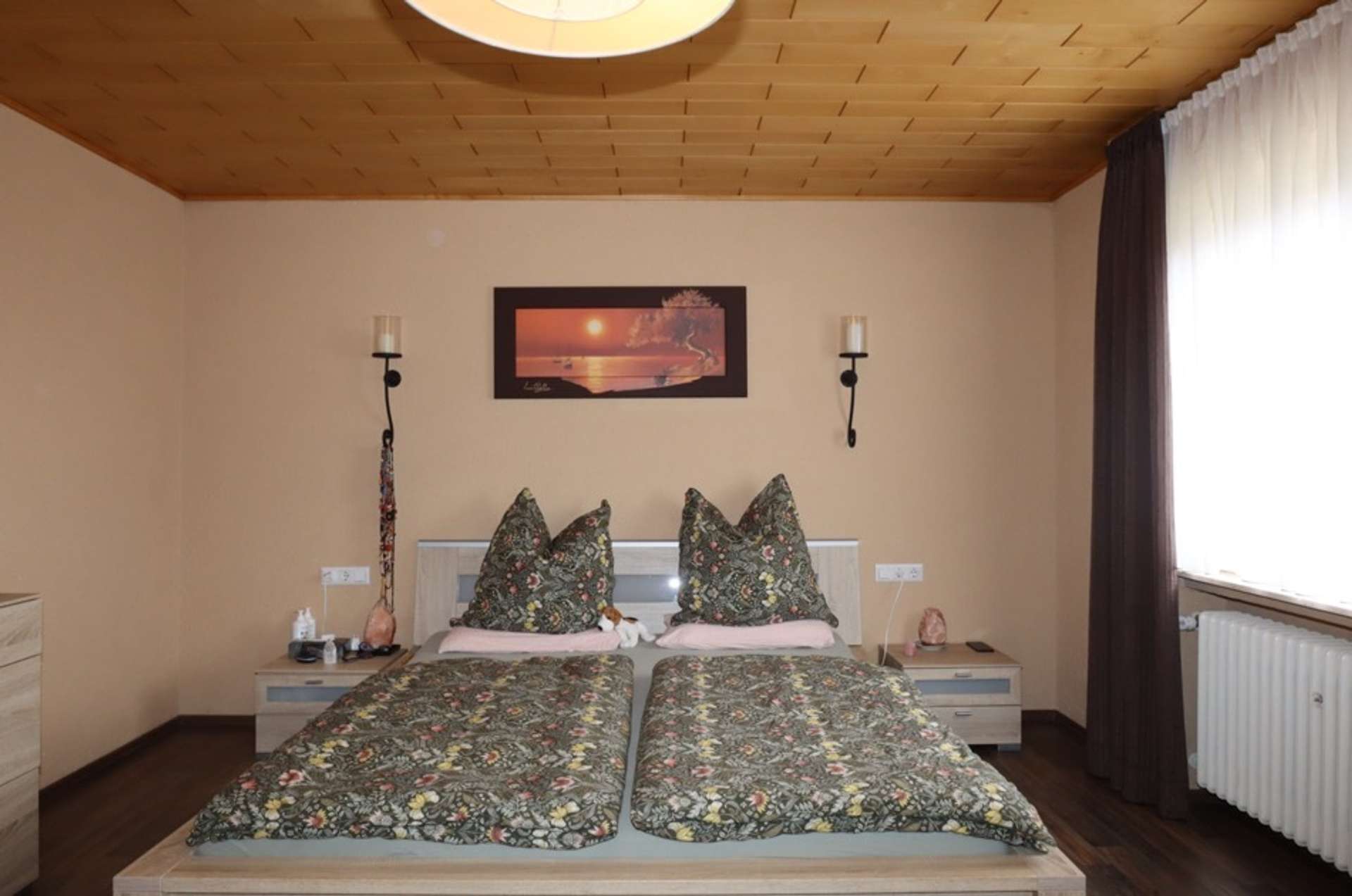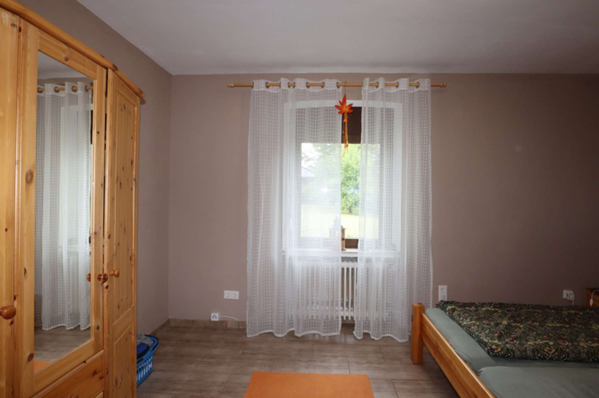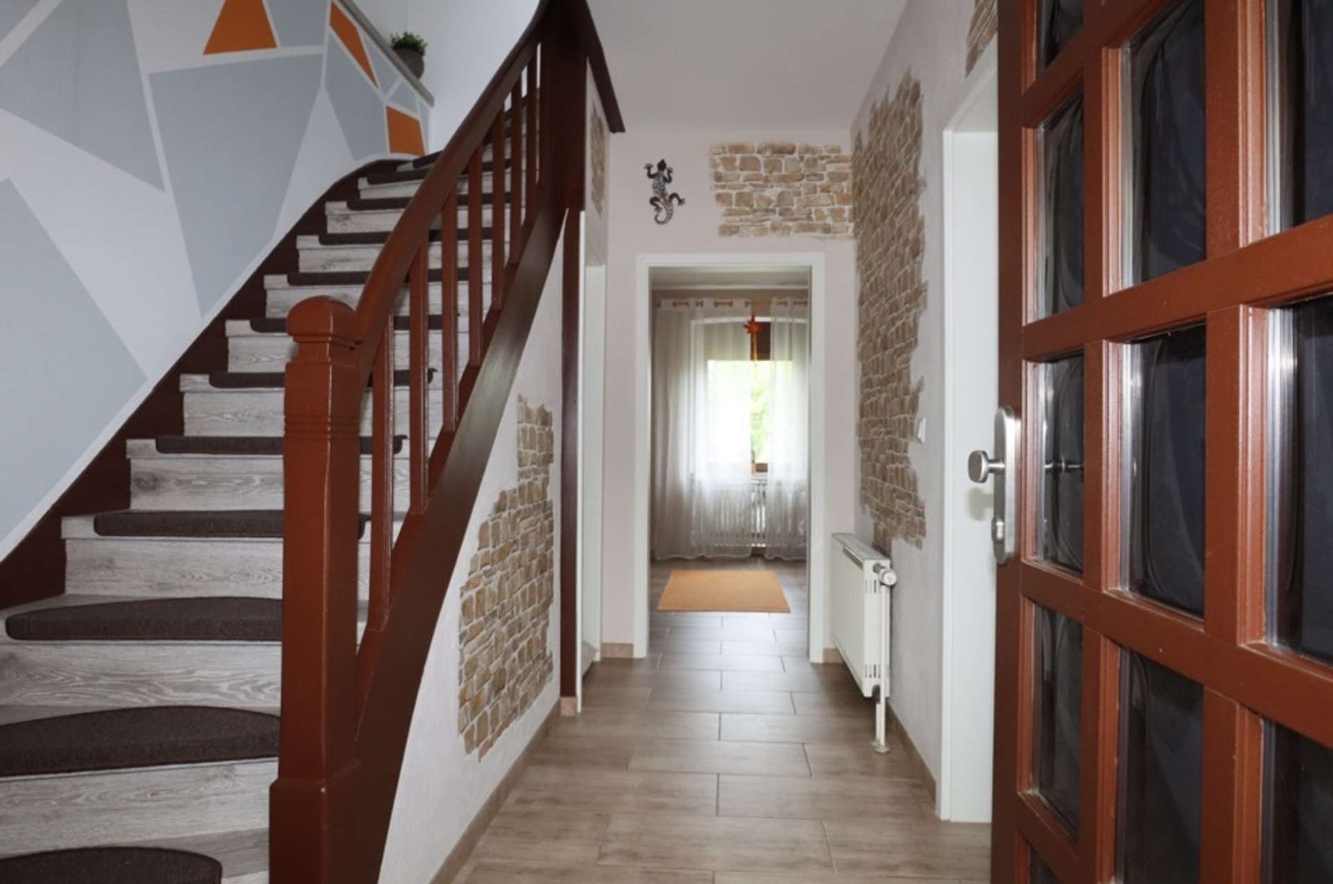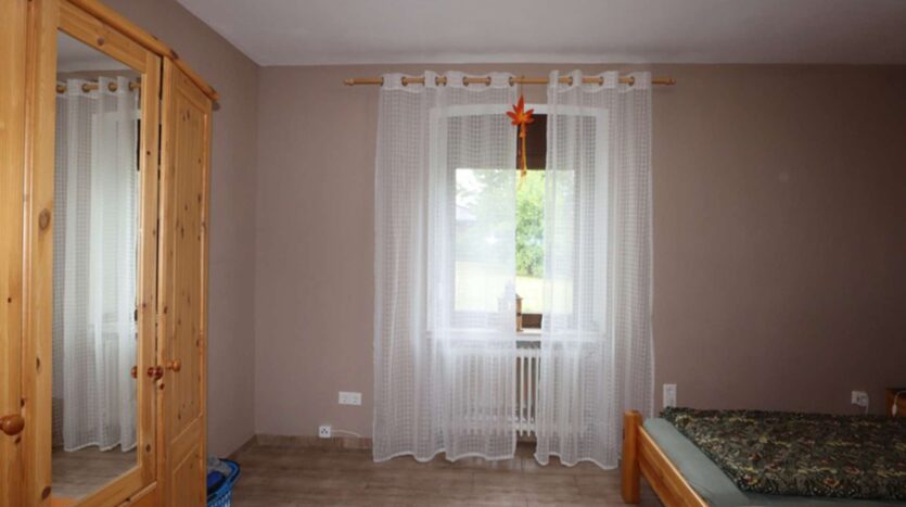 Der Eingang links führt in den später angebauten Gebäudeteil mit insgesamt zwei Schlafzimmern und einem Badezimmer im Obergeschoss und Küche mit Essbereich sowie ein gemütliches Wohnzimmer mit Zugang zum Garten im Erdgeschoss.