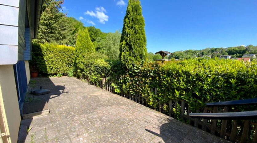 Das Eckhaus hat ein ebenerdiges Grundstück liegt in einem Park. Am Haus befindet sich eine gepflasterte Terrasse. Die Terrasse ist direkt vom Wohnzimmer zu betreten. Der Weitblick von der Terrasse ist traumhaft schön.