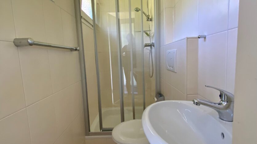 Das EG ist aufgeteilt in einen gefliesten Flur, Badezimmer (Dusche, Toilette und Waschbecken), offene Küche mit Ess- und Wohnbereich und 2 Schlafzimmern.