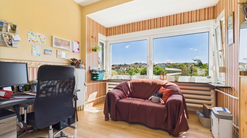 Ein echtes Highlight ist das helle Büro mit stilvollen Flügeltüren und einem traumhaften Blick ins Grüne – ein Ort der Ruhe und Inspiration. Ein gemütliches Schlafzimmer sowie ein großzügiges Wohnzimmer mit Zugang zum Balkon runden das Erdgeschoss ab. Von hier aus genießen Sie einen herrlichen Panoramablick über die Ortschaft – ein Ort zum Verweilen und Durchatmen.
