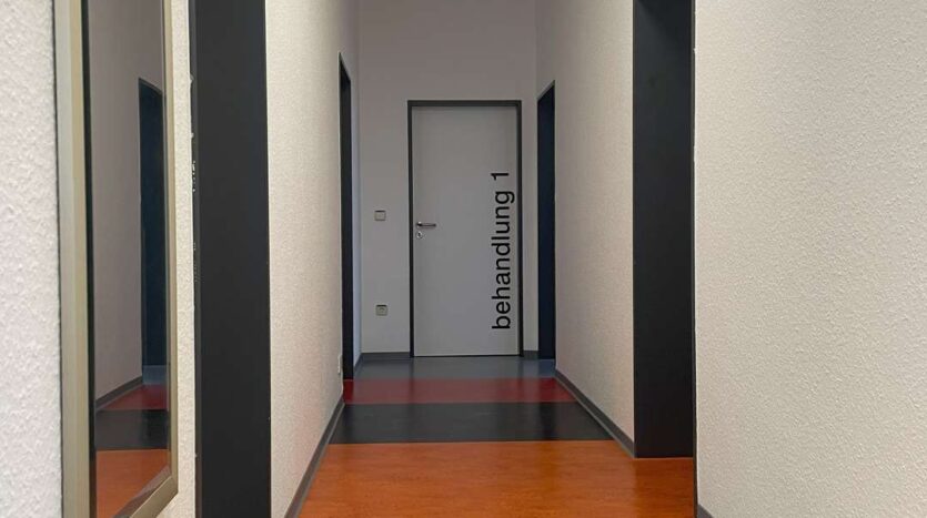 Flur, Anmeldung, 10 Räume, Wartebereich, Küche, zwei Toiletten, zwei Abstellräume.