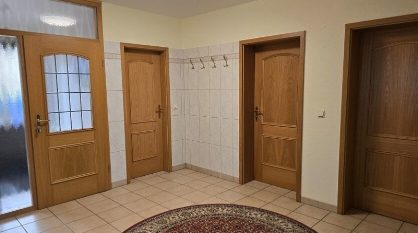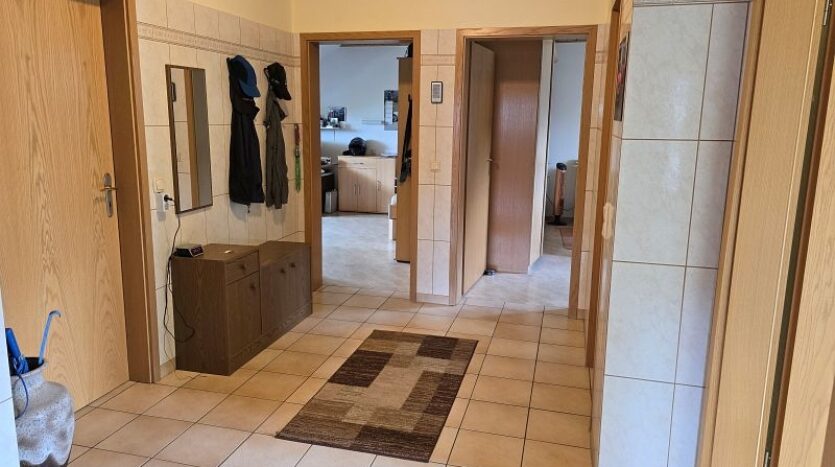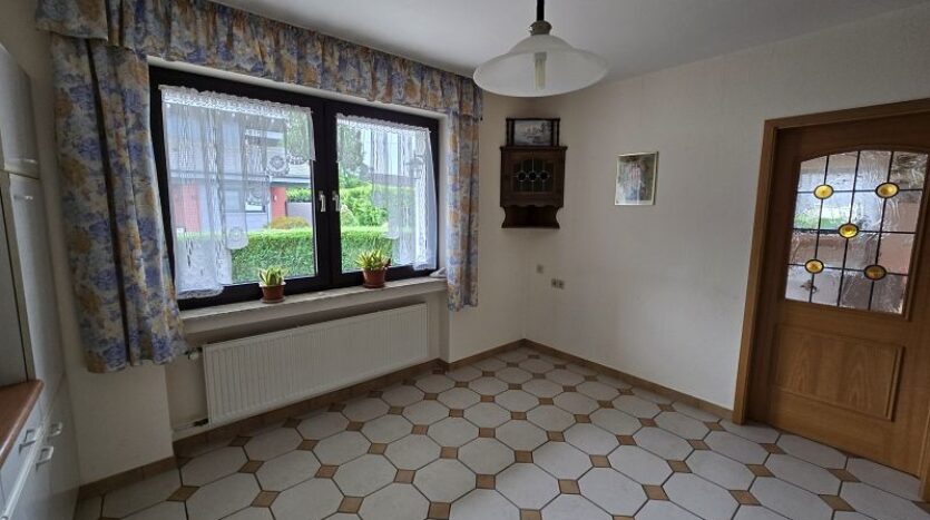 Von der Diele im Erdgeschoss gelangt man auch bei jeder Wetterlage trockenen Fußes zur Garage, zur Heizung und auf das Gartengrundstück hinter und neben dem Haus.