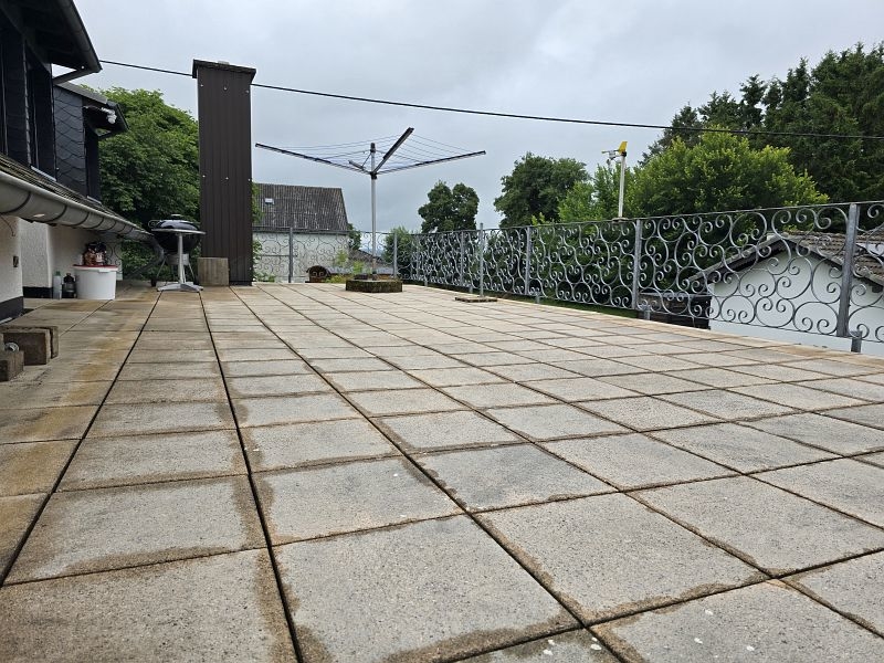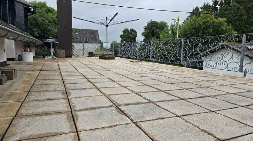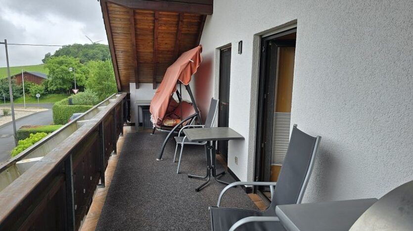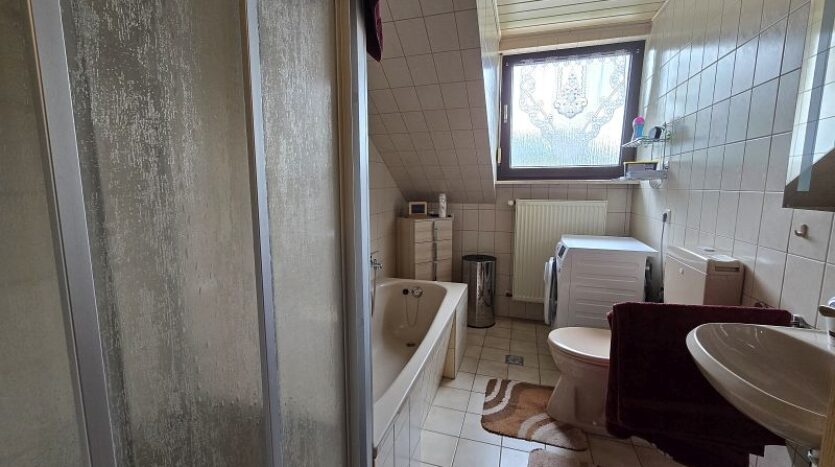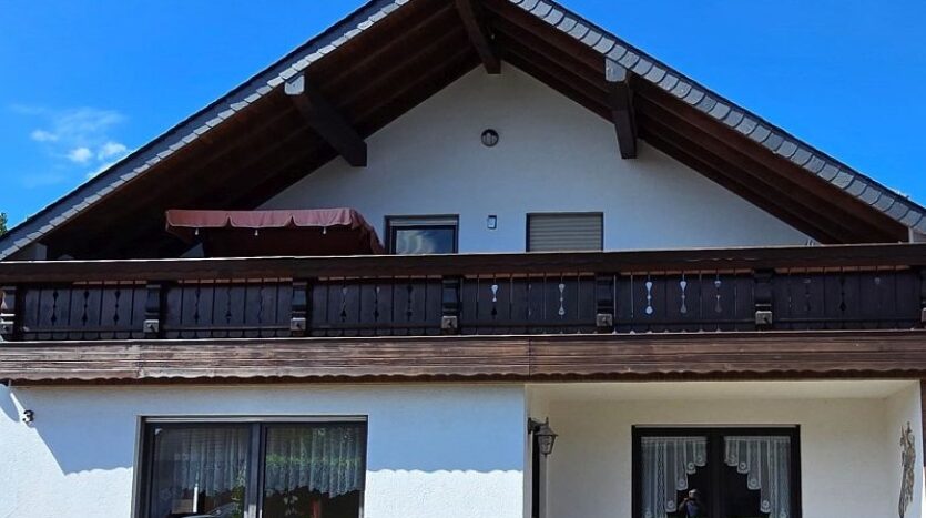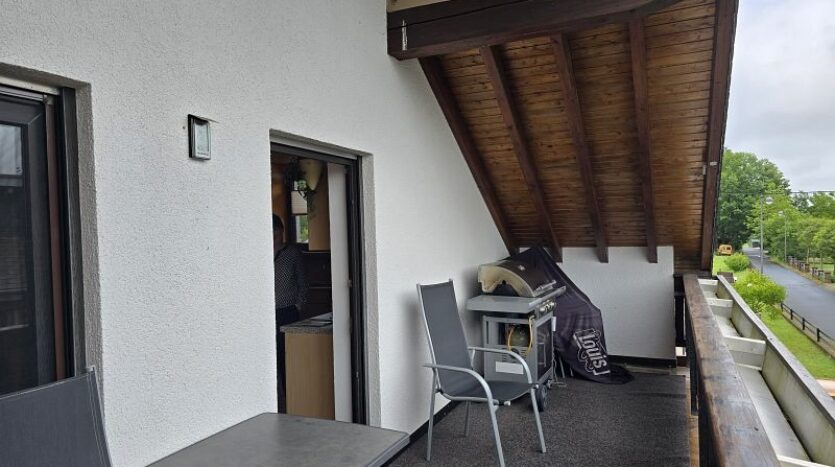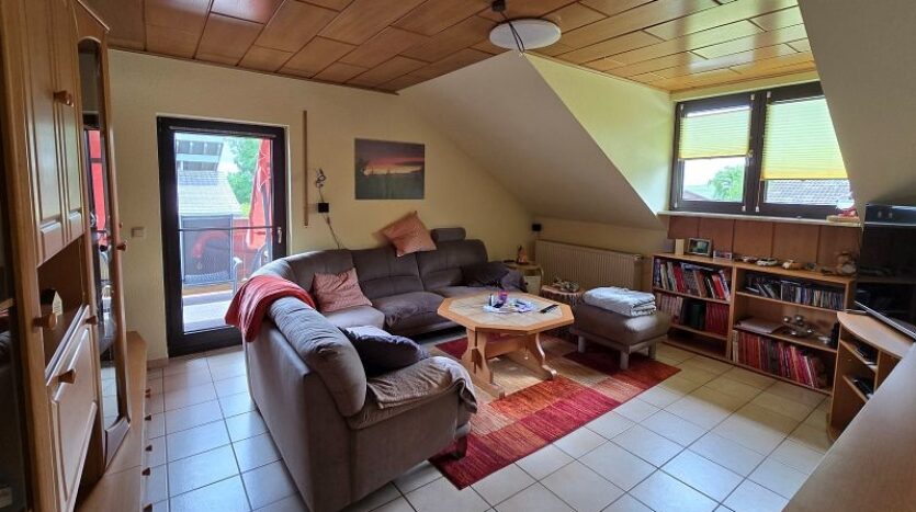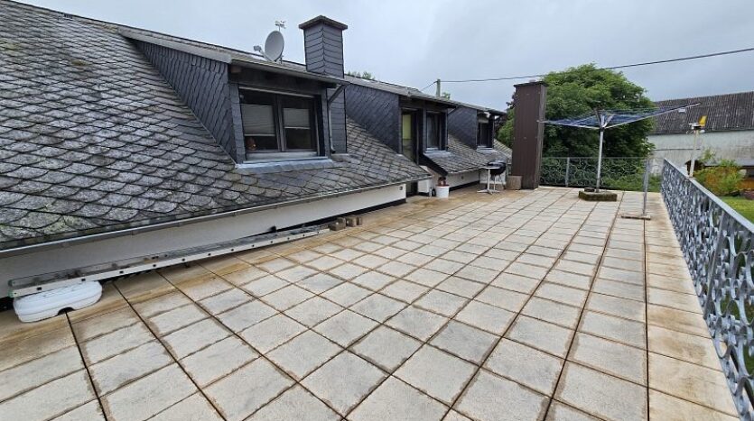 Die Wohnung im Dachgeschoss (ca. 120 m²) verfügt über eine Diele, drei Schlafzimmer, ein Tageslichtbad mit Dusche und Badewanne, ein Hauswirtschaftsraum, eine Küche (ohne Einbauküche) und ein Wohnzimmer. Vom Wohnzimmer aus gelangt man auf den sehr großen und überdachten Balkon. Als weiteres Highlight wurde das Garagendach zur Außenterrasse ausgebaut. Ein wirklich perfekter Platz an der Sonne. Das rundum laufenden handgefertigte Terrassengeländer wurde verzinkt und ist somit gegen lästige Rostbildung dauerhaft geschützt.