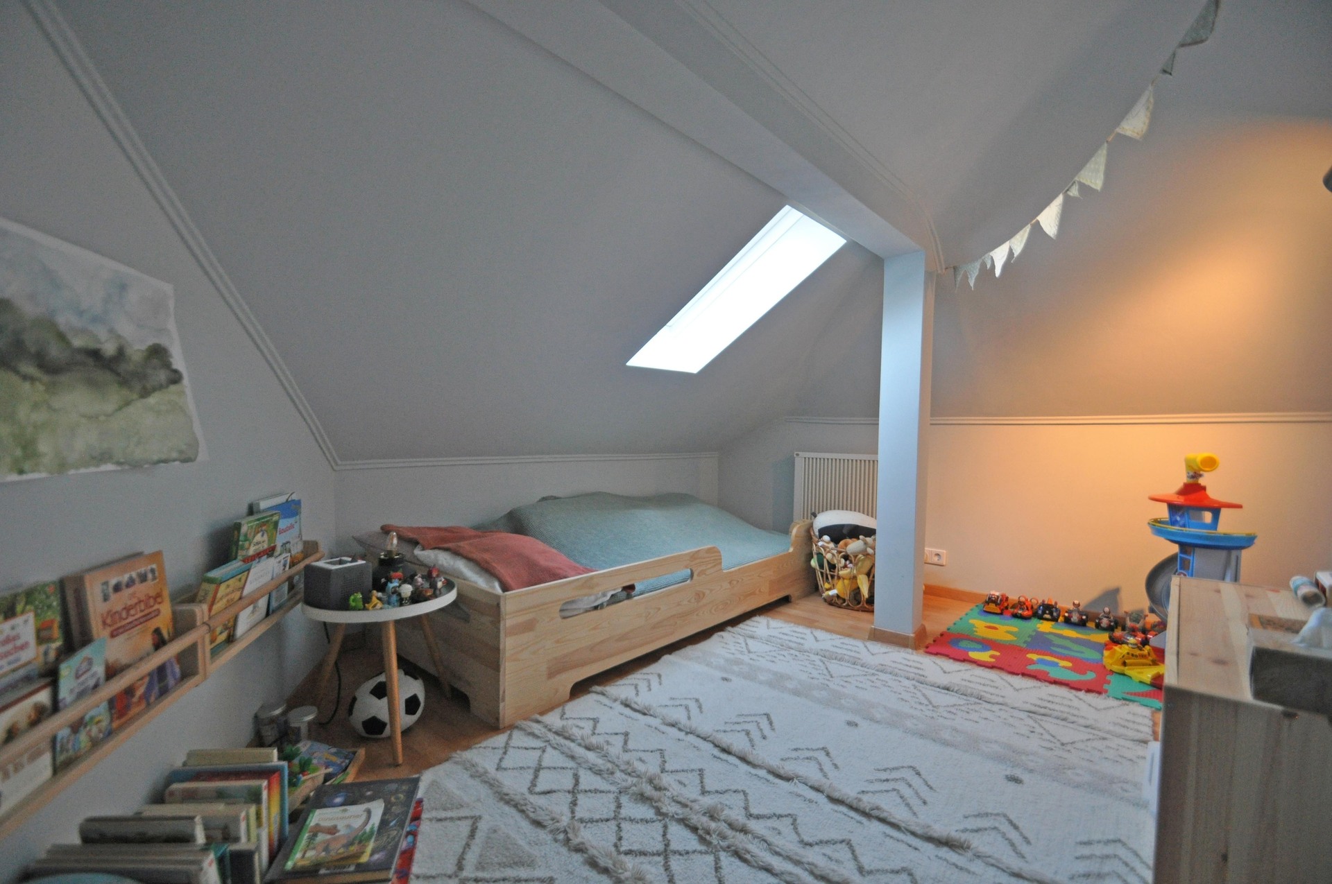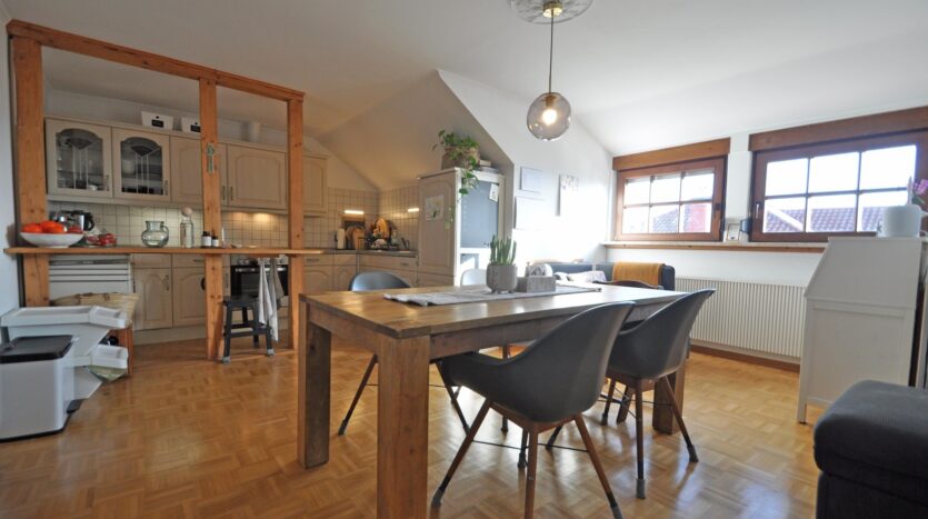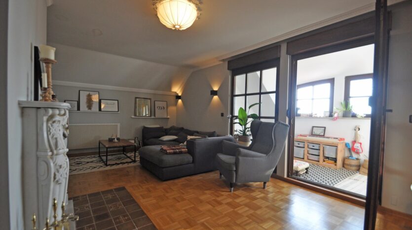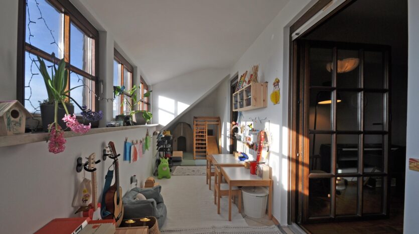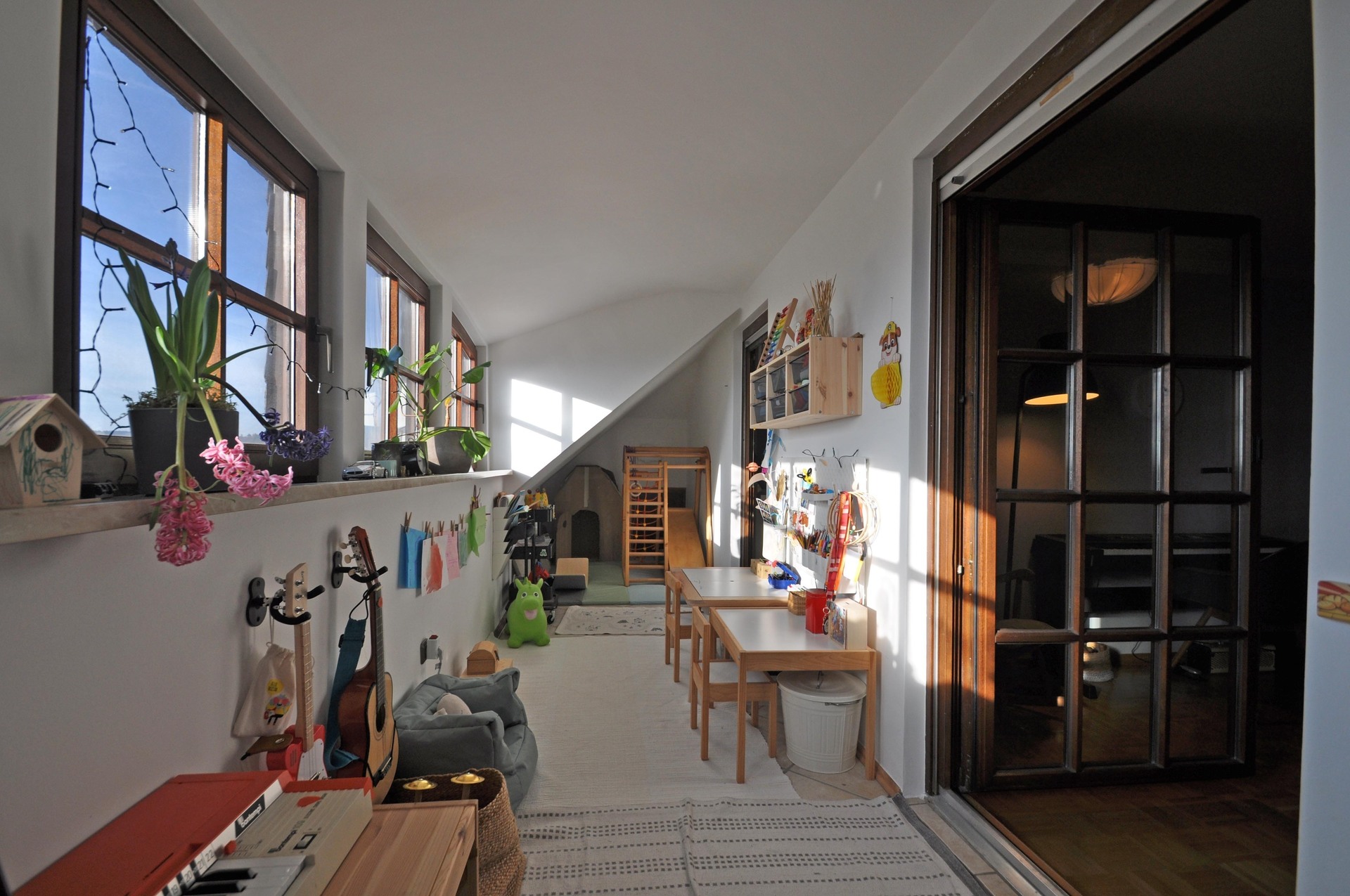 Über das Treppenhaus gelangen Sie zu der separaten Wohnung im Dachgeschoss. Hier gelangen Sie aus der Diele zunächst in die Küche mit Essbereich. Das Wohnzimmer dieser Einheit bietet ebenfalls einen Holzofen für eine warme Wohlfühlatmosphäre. Direkt neben dem Wohnzimmer liegt das erste Schlafzimmer. Aus diesem Schlafzimmer und dem Wohnzimmer gelangen Sie auf eine geschlossene Loggia, die den Wohnraum erweitert und zum verweilen einlädt. Alternativ hier kann ein Spielbereich für die kleinsten angelegt werden. Die Dachgeschosswohnung bietet ein kleines Kinderzimmer und ist somit auch für eine kleine Familie geeignet. Das Tageslichtbad mit Wanne und Dusche ist groß und verfügt neben dem WC zusätzlich über ein Bidet.
