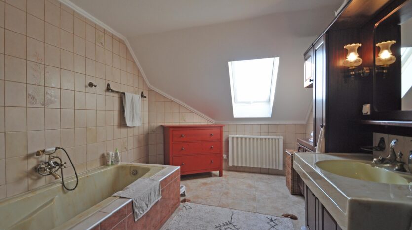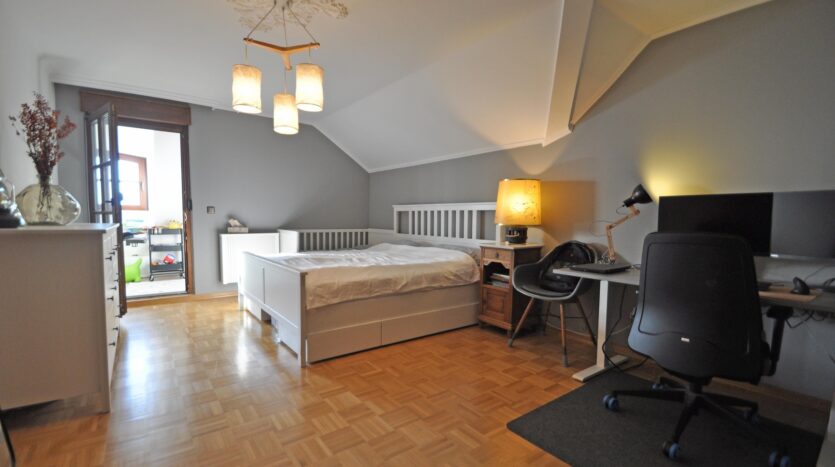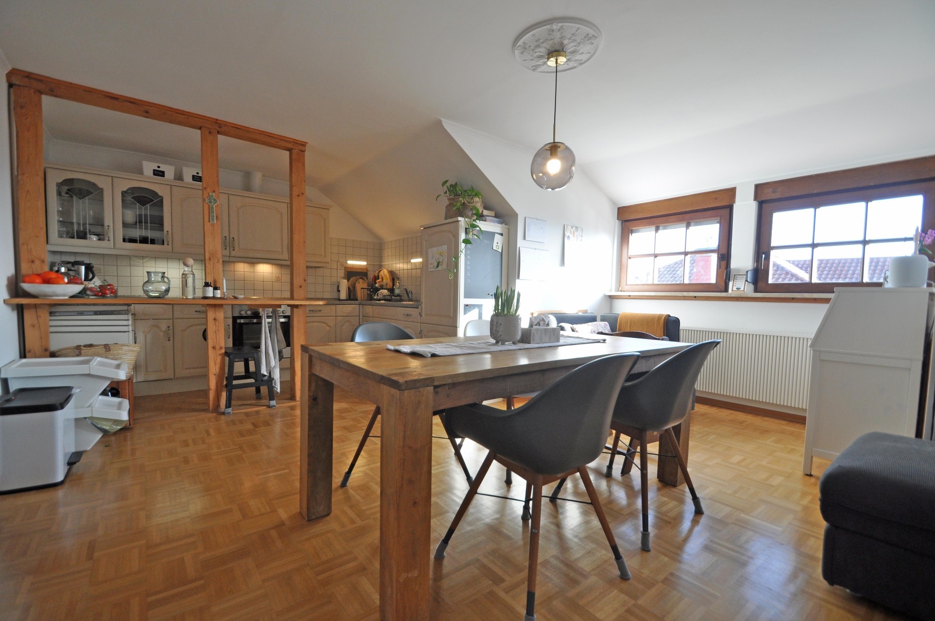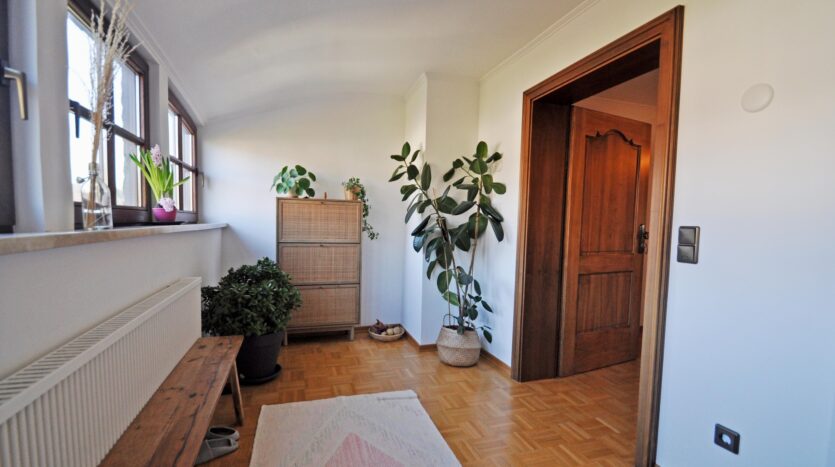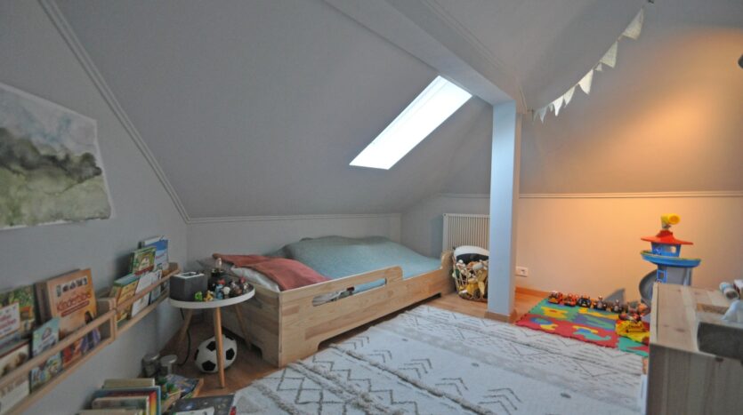 Über das Treppenhaus gelangen Sie zu der separaten Wohnung im Dachgeschoss. Hier gelangen Sie aus der Diele zunächst in die Küche mit Essbereich. Das Wohnzimmer dieser Einheit bietet ebenfalls einen Holzofen für eine warme Wohlfühlatmosphäre. Direkt neben dem Wohnzimmer liegt das erste Schlafzimmer. Aus diesem Schlafzimmer und dem Wohnzimmer gelangen Sie auf eine geschlossene Loggia, die den Wohnraum erweitert und zum verweilen einlädt. Alternativ hier kann ein Spielbereich für die kleinsten angelegt werden. Die Dachgeschosswohnung bietet ein kleines Kinderzimmer und ist somit auch für eine kleine Familie geeignet. Das Tageslichtbad mit Wanne und Dusche ist groß und verfügt neben dem WC zusätzlich über ein Bidet.