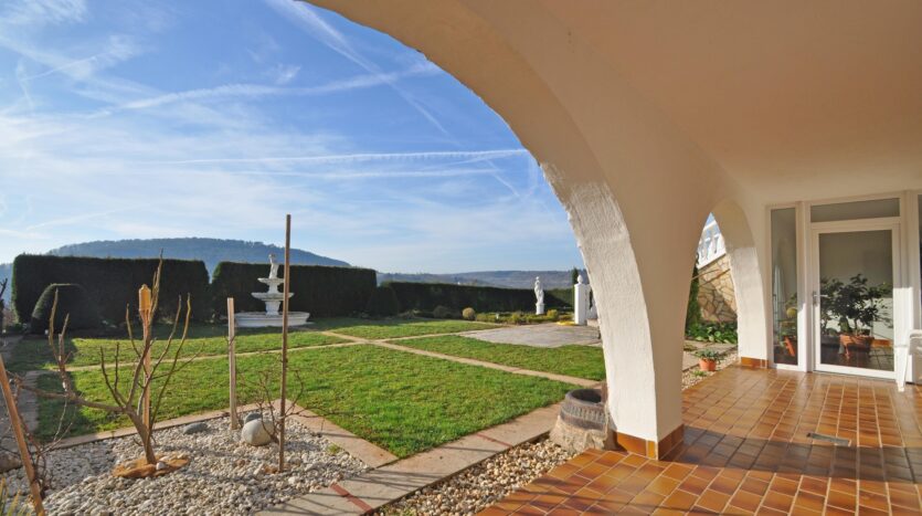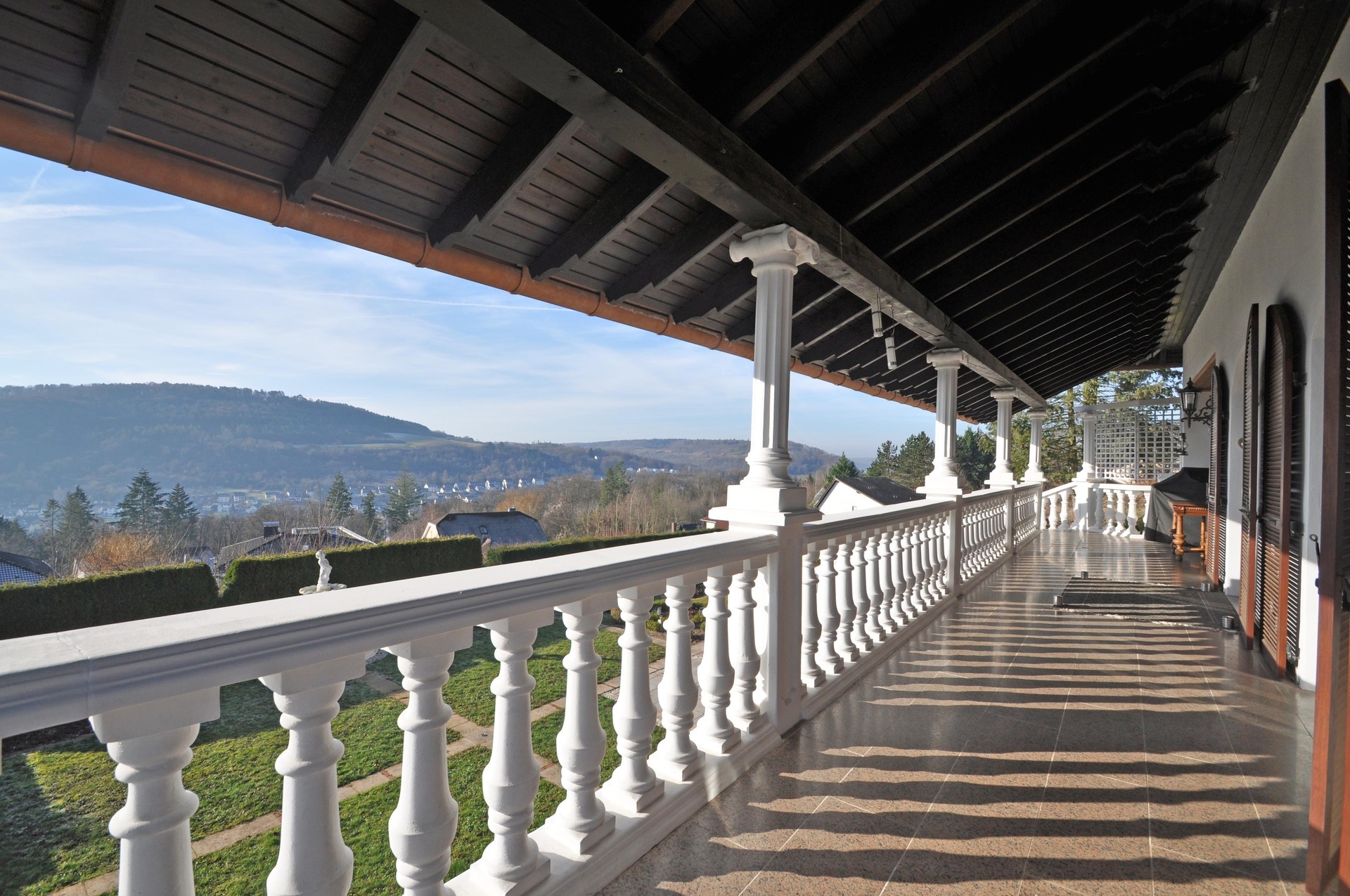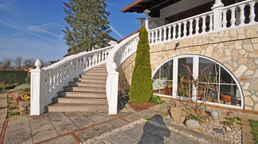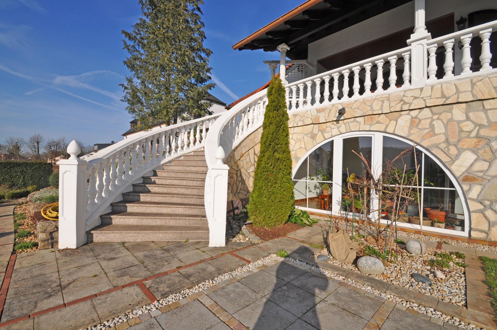 + Balkon und Terrasse mit geschwungener Granit-Treppe zum Garten
