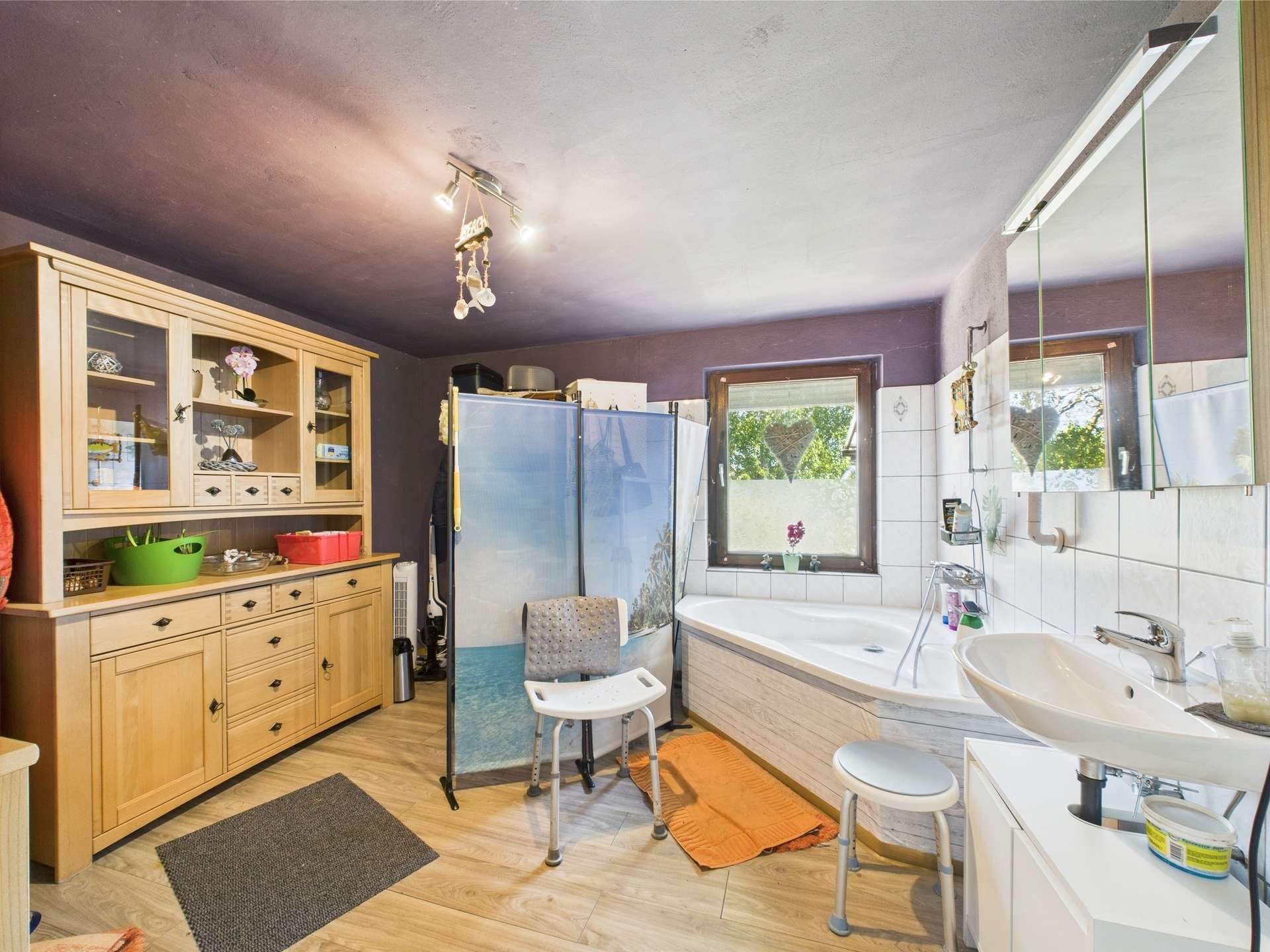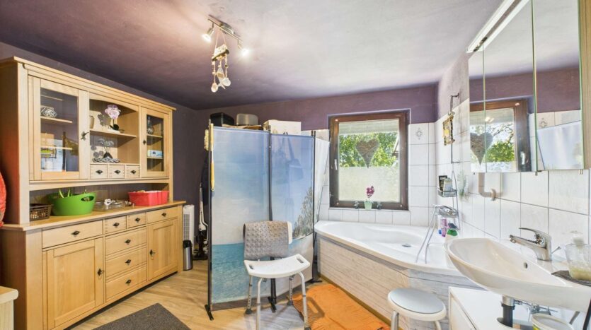 Im Erdgeschoss erwartet Sie ein praktisches Büro, ein Waschraum mit direktem Zugang zu einem Bad mit Dusche sowie der Zugang zum Anbau, der wiederum direkt in den herrlichen Garten führt. Der linke Teil dieser Ebene punktet mit einem Durchgangszimmer, das ins Schlafzimmer und einen Abstellraum mit weiterem Außenzugang führt – ideal für eigene Rückzugsorte oder ein Gästezimmer.