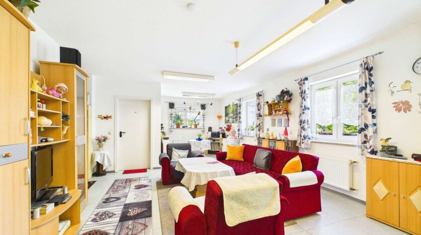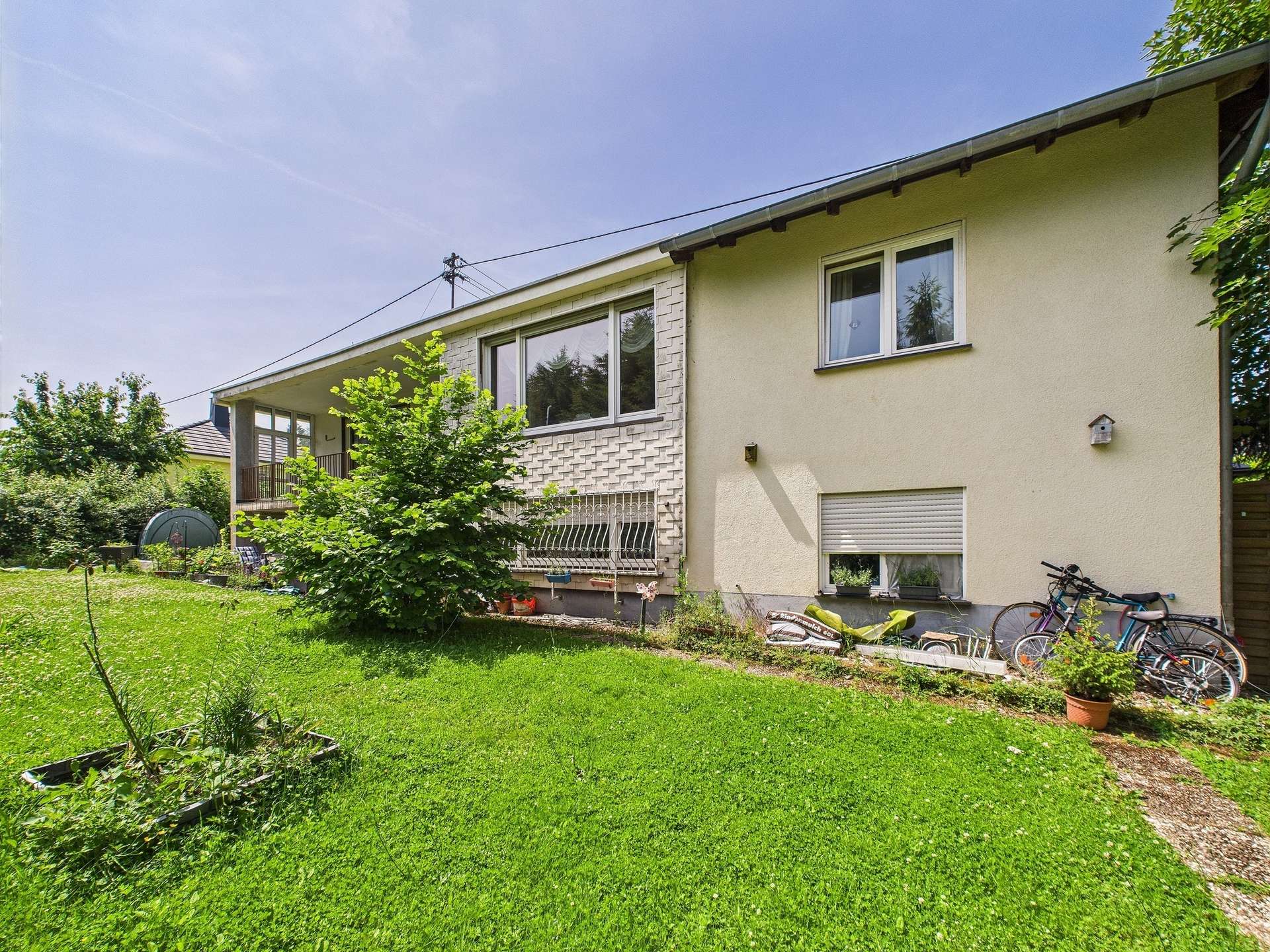 Die im Jahr 1971 errichtete Immobilie wurde 1999 um einen Anbau erweitert und bietet heute zwei vollständig nutzbare Wohneinheiten. Die Hauptwohnung erstreckt sich über etwa 177 m² und empfängt Sie über eine gepflegte Hoffläche mit Garage und Carport. Im Inneren stehen Ihnen 6 Zimmer, eine Küche, ein Gäste WC und zwei Badezimmer zur Verfügung – ein ideales Raumangebot für Familien, die Großzügigkeit und Funktionalität schätzen. Ein sonniger Balkon mit Blick ins Grüne lädt zum Durchatmen und Entspannen ein.