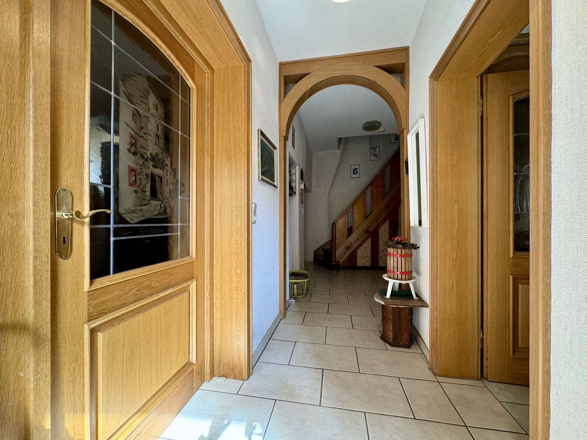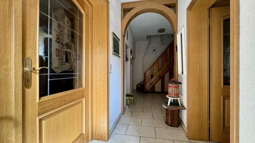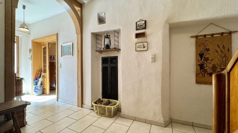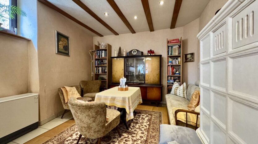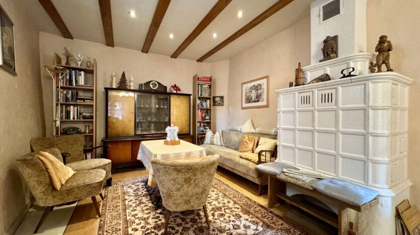 Das denkmalgeschützte Einfamilienhaus, von der Straße aus bequem erreichbar, heißt Sie über wenige Stufen im einladenden Eingangsbereich willkommen. Zu Ihrer Linken öffnet eine große Glastür den Weg in den behaglichen Wohn- und Essbereich, dessen besonderes Highlight der stilvolle Kachelofen ist – perfekt für gemütliche Stunden mit Ihren Liebsten.