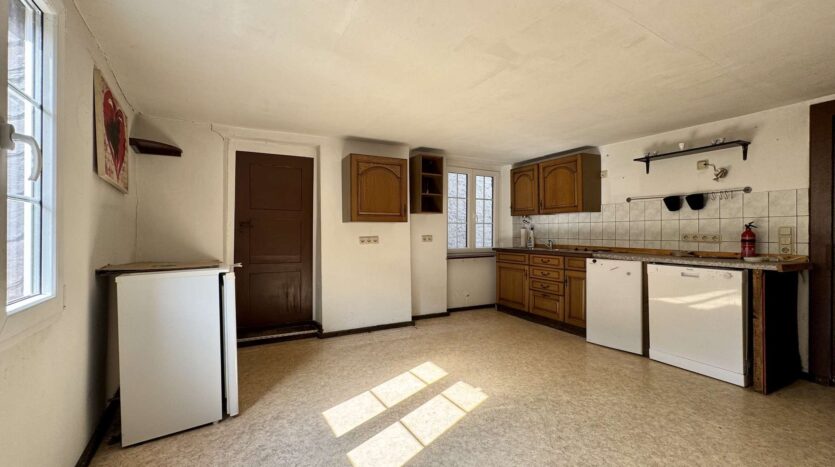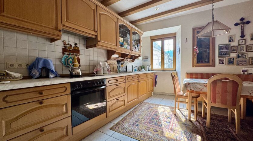 Eine Einbauküche ist vorhanden. Ebenso ein Kachelofen und teilweise Elektroheizung.