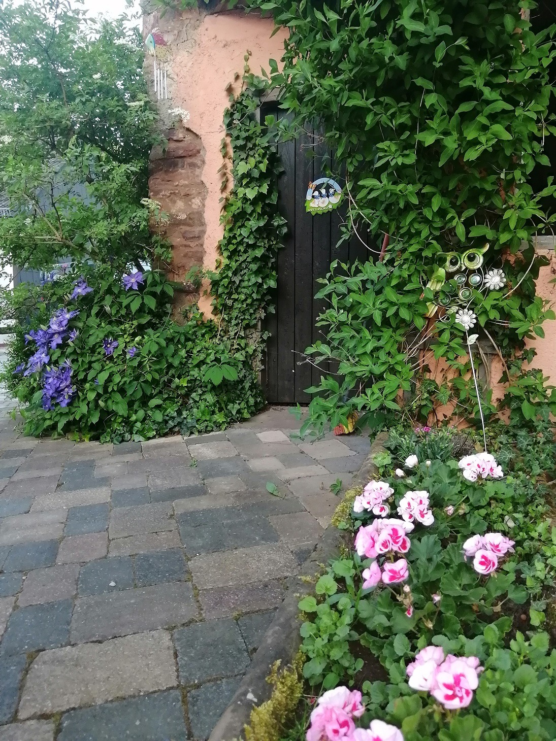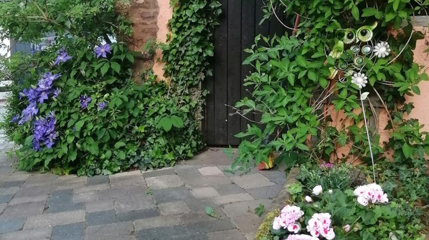 Der Innenhof ist teils gepflastert mit Wiese und Sträucher und Pflanzen versehen.