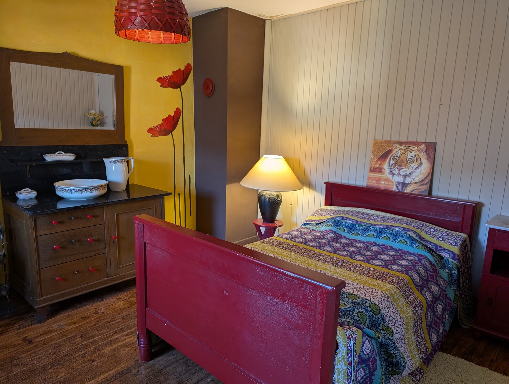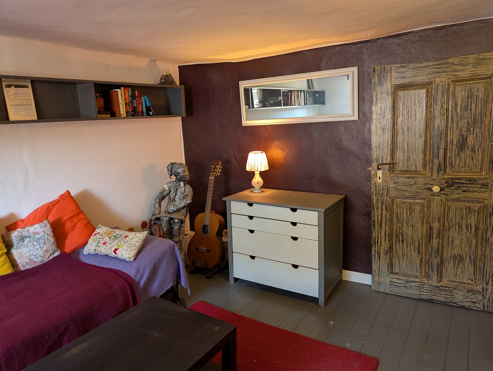 Vloeren bestaan voornamelijk uit houten planken. Verder zijn er antieke binnendeuren, een antieke kast en een wandklok.