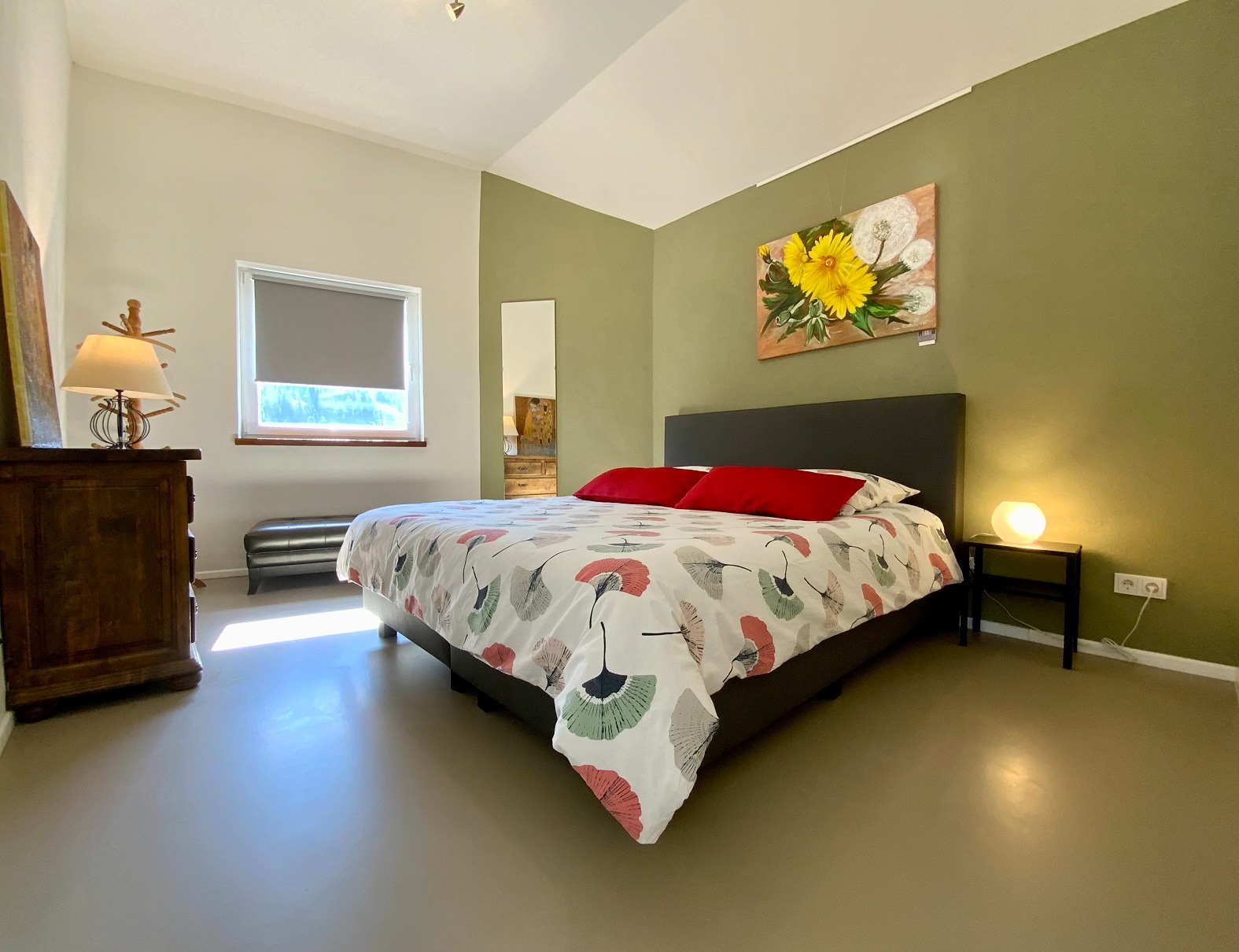 De vloeren zijn van nieuwe betonnen plafonds en de kamers zijn zeer open tot aan het dak, wat een romantische sfeer in het huis creëert.