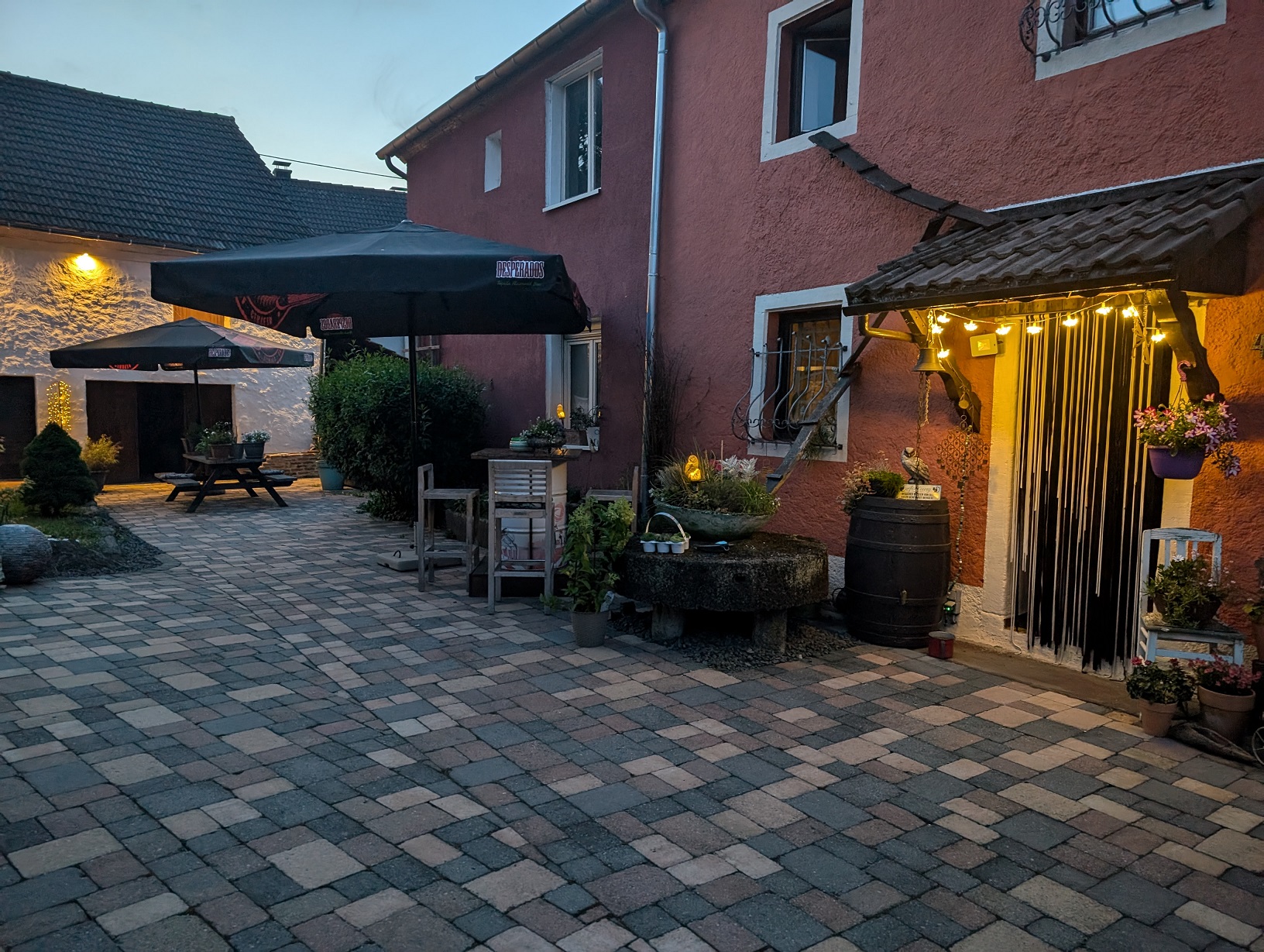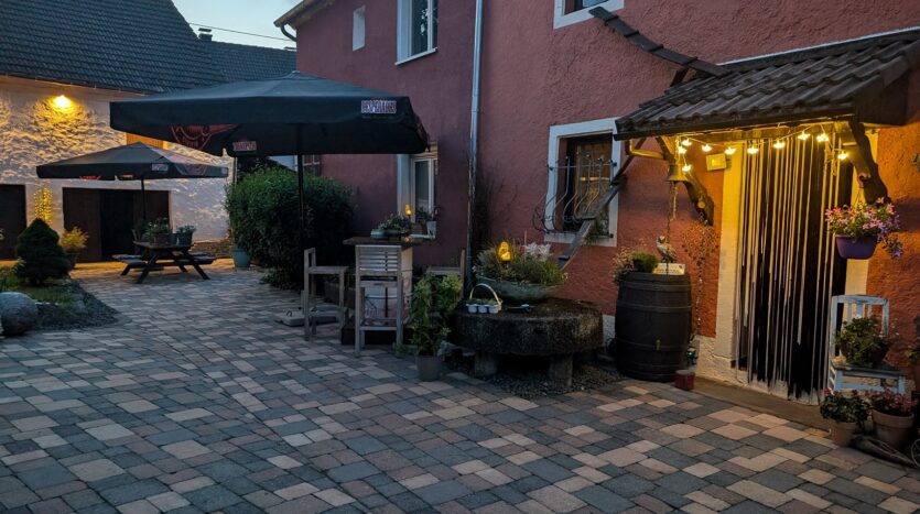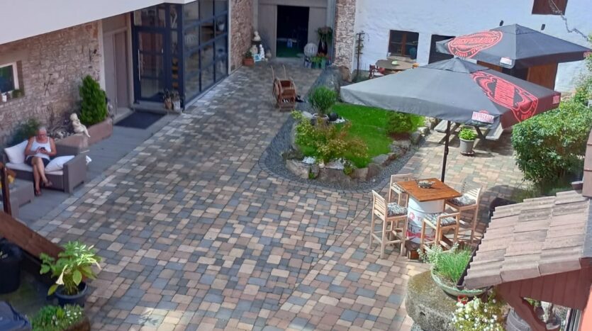 Der Innenhof ist das zentrale Prachtstück vom Objekt. Hier spielt sich das Leben im Frühjahr, Sommer und Herbst ab. Im Innenhof wurden natürliche Materialien verarbeitet die aus dem historischen Objekt stammen. Mehrere Sitzmöglichkeiten mit einem Tisch aus Mühlensteinen, Sandsteinbecken, etc. befinden sich in dem traumhaft schönen Innenhof.