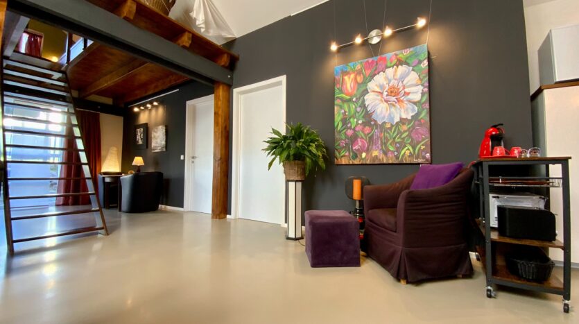 Hal, open keuken met woonkamer, 1 slaapkamer, badkamer en een omgebouwde vide welke is omgebouwd tot slaapkamer.