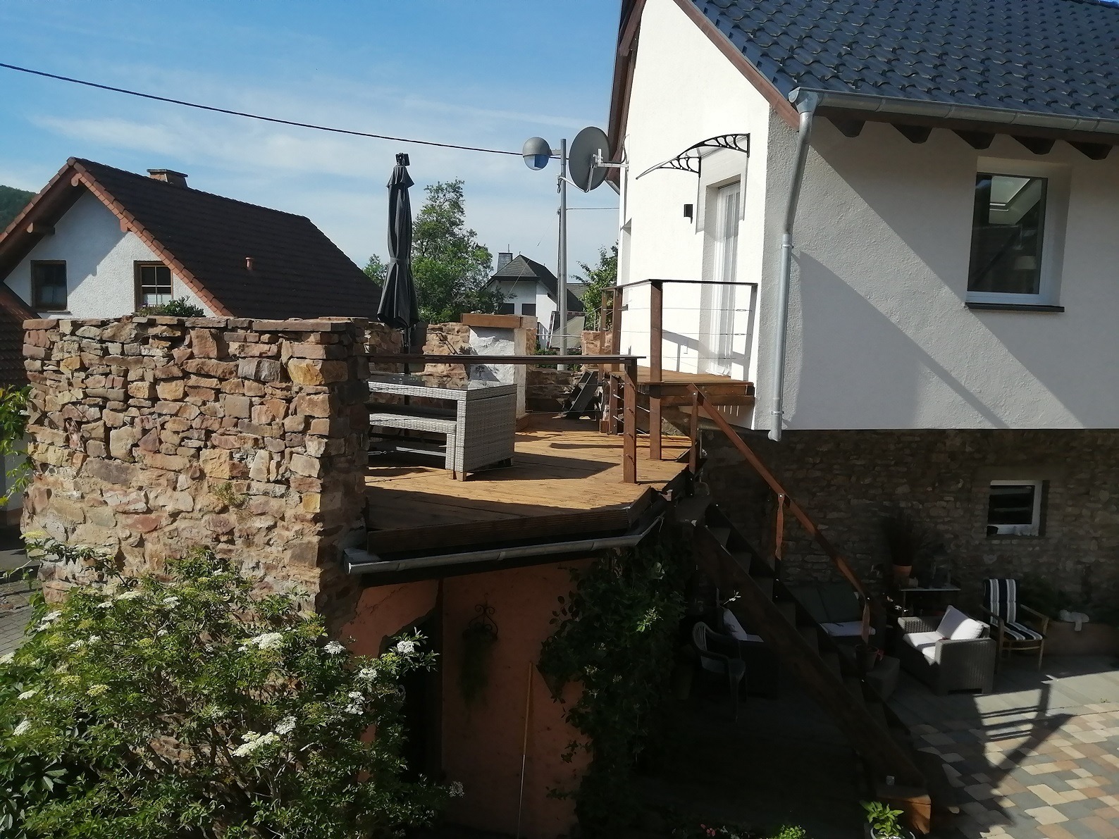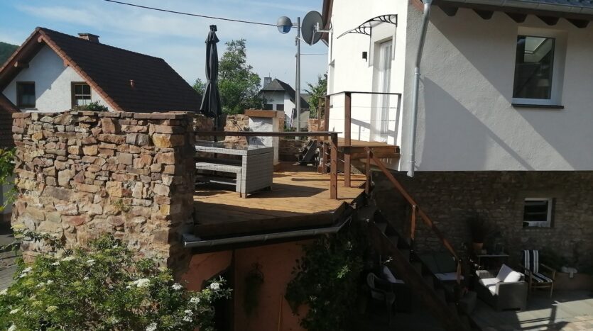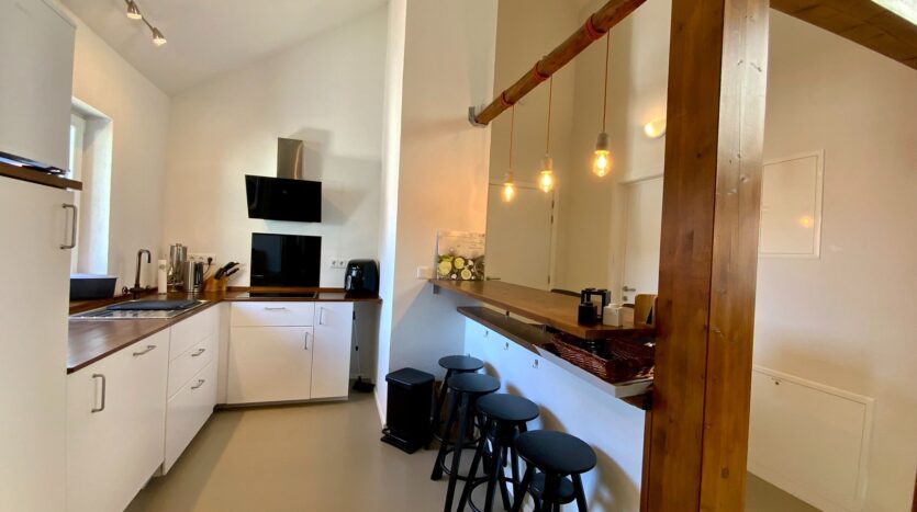 Das geräumige und von innen komplett neu aufgebaute ehemalige Nebengebäude (Mauer mit Isolierten Poroton Stein) mit seinen 2 Ferienwohnungen von jeweils ca. 80 m² und 120 m² wurde in solider Bauweise mit errichtet und spiegelt den Charme seiner Zeit wider. Ein Teil des Mauerwerks besteht aus Bruchstein der sichtbar belassen wurde.