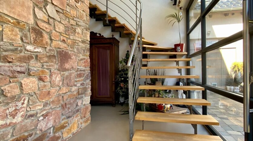 Het ruime en geheel herbouwde voormalige bijgebouw (muur met geïsoleerde Porotonsteen) met zijn 2 vakantiewoningen van ca. De woningen van 80 m² en 120 m² zijn solide gebouwd en weerspiegelen de charme van die tijd. Een deel van het metselwerk bestaat uit puinsteen dat zichtbaar is gelaten.