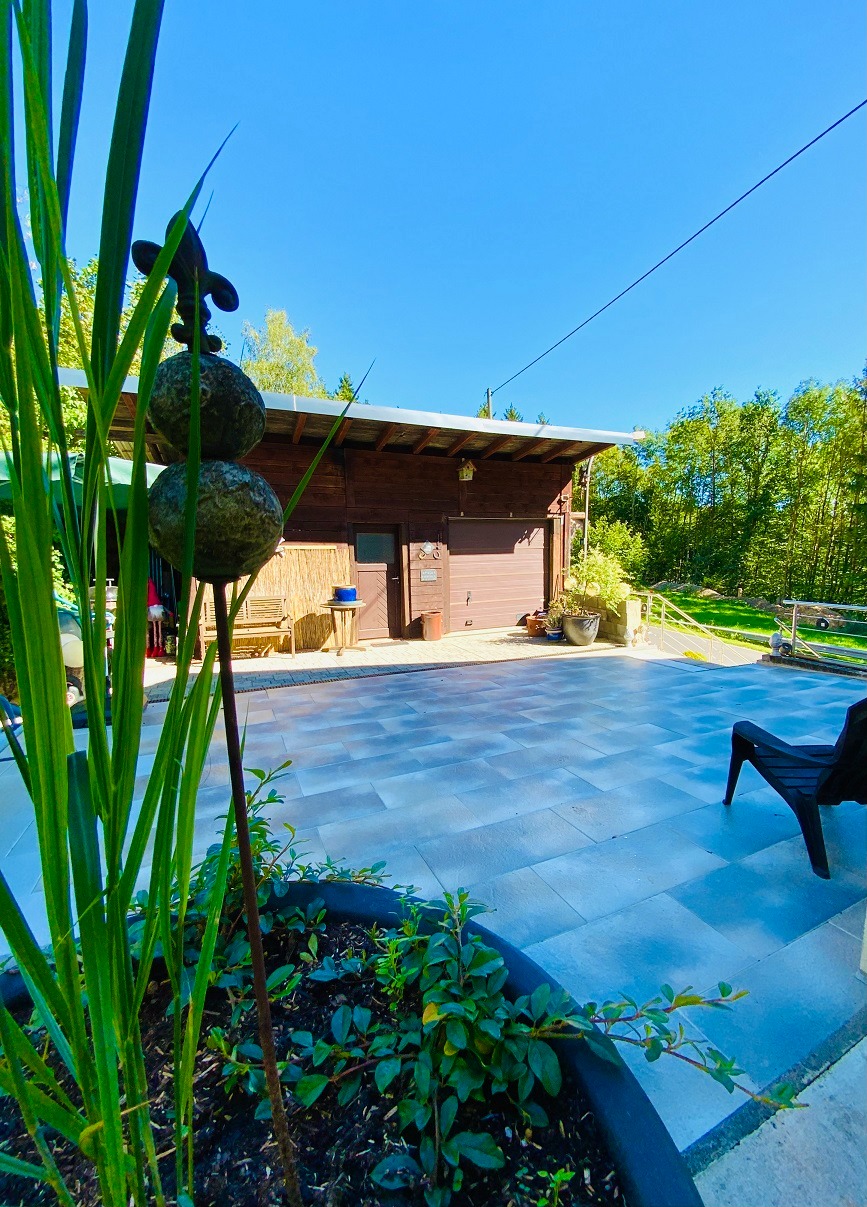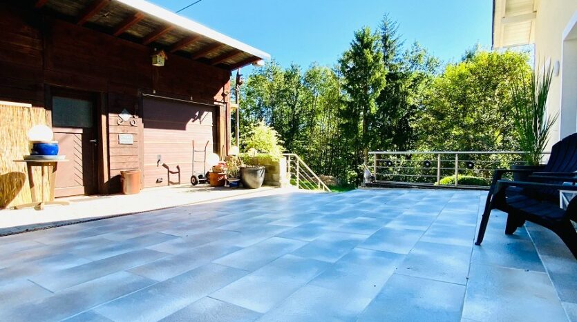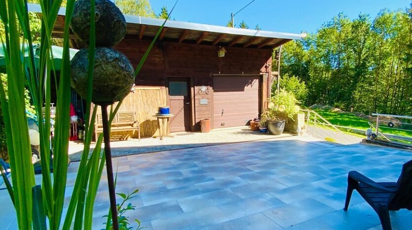Auf der großen Terrasse an der rechten (Ost-) Seite des Hauses befindet sich noch ein Nebengebäude aus Holz.