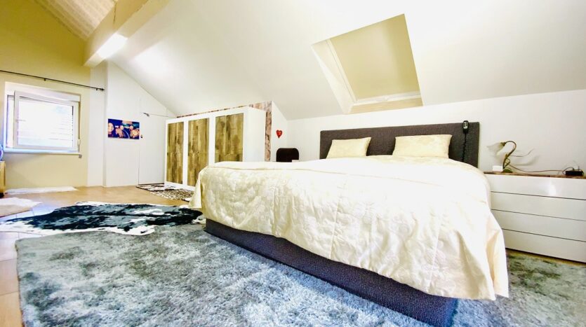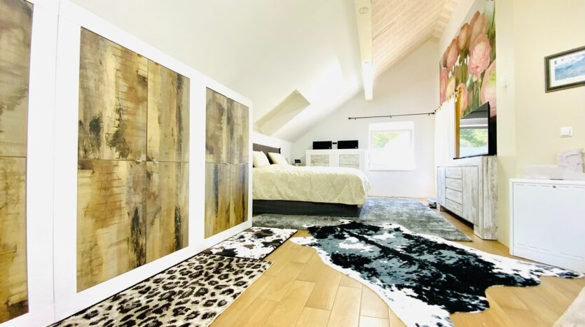 Dieses einmalige große Schlafzimmer, ist bis in die Spitze des Daches offen gestaltet. Ein einmalig schöner Raum welcher zusätzlich über ein Ankleidezimmer und ein Badezimmer verfügt.