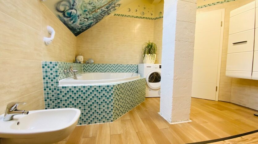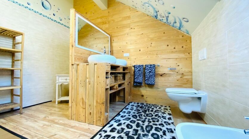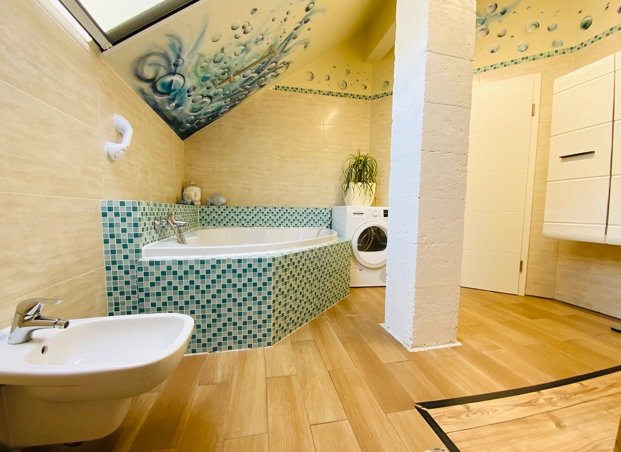 Das Badezimmer ist sehr geräumig gestaltet. Hier befindet sich ein Doppelwaschbecken, Toilette, Badewanne und die Vorrichtung für eine Dusche.