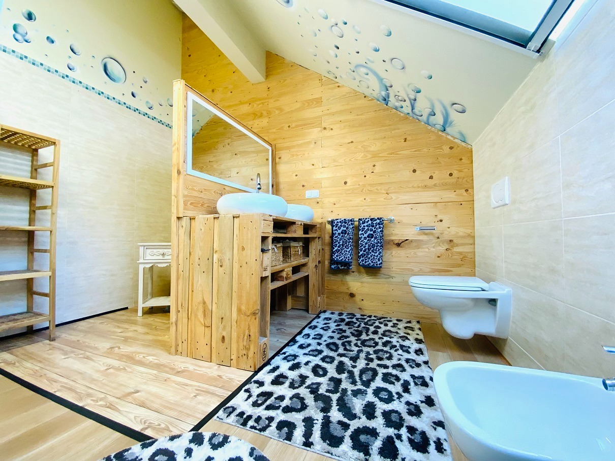 Een massieve trap van fijn hout leidt naar de bovenverdieping. Vanaf de trap bereikt u via een glazen schuifdeur de prachtige slaapkamer.