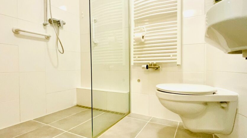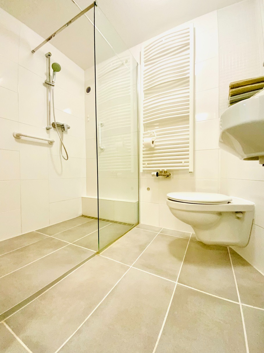 De badkamer is zeer ruim. Hier bevindt zich een dubbele wastafel, toilet, ligbad en de mogelijkheid voor een douche.