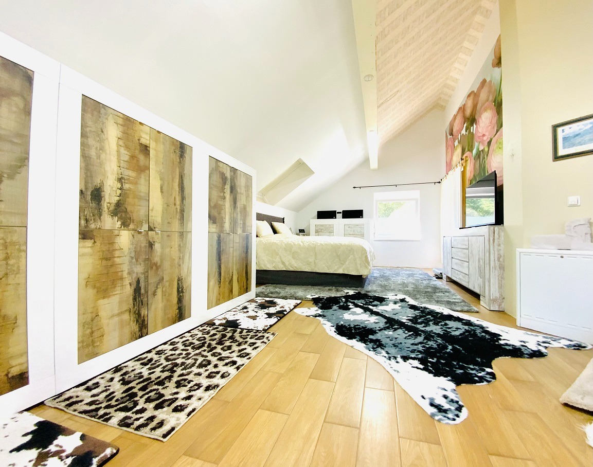Deze unieke, grote slaapkamer is open tot aan de bovenkant van het dak. Een uniek mooie kamer welke tevens beschikt over een kleedkamer en een badkamer.
