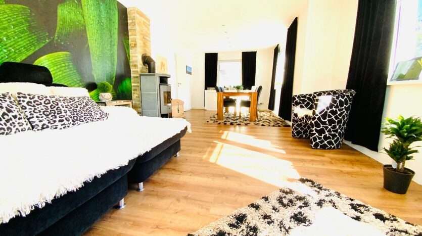 Nach betreten der neuen moderne Hauseingangstür gelangt man in einen großen Flur. Über die komplette linke Seite des Flures zieht sich ein großes Wohnzimmer mit Zugang zur Terrasse an der Südwest Seite.