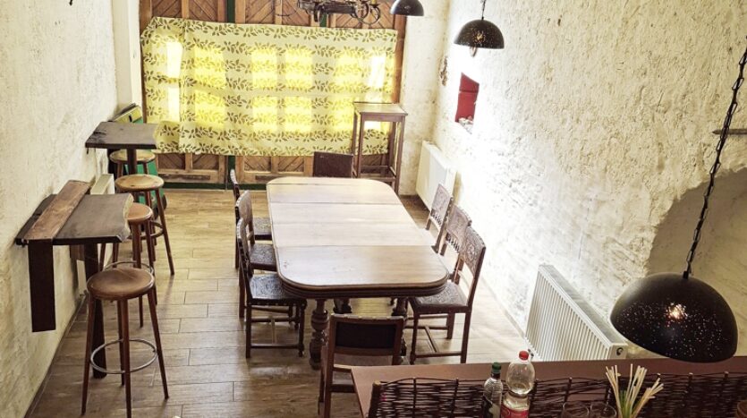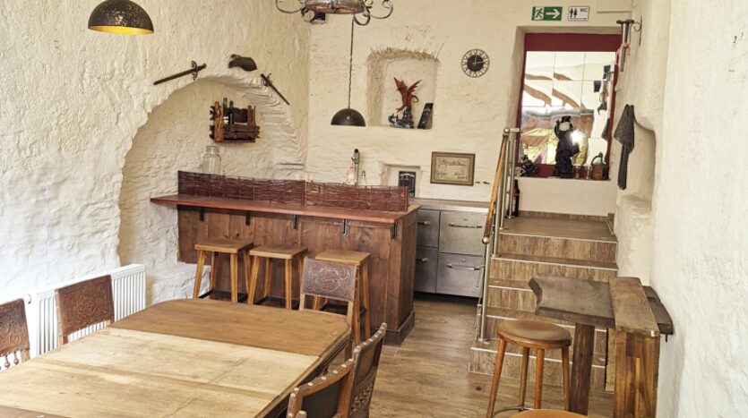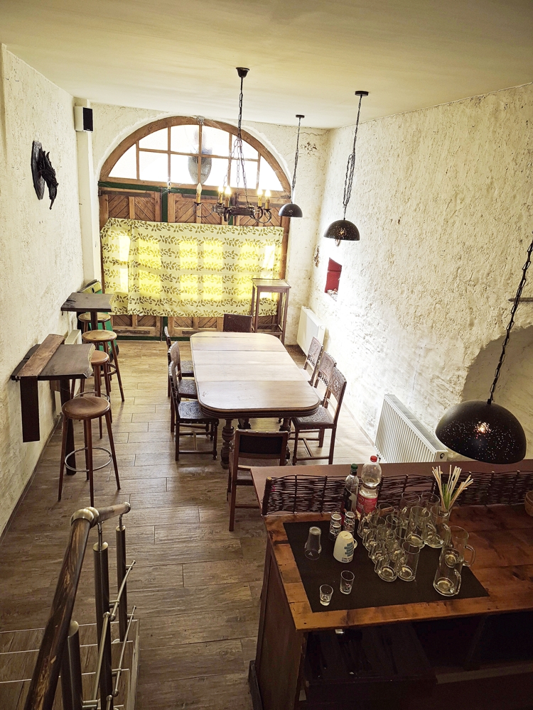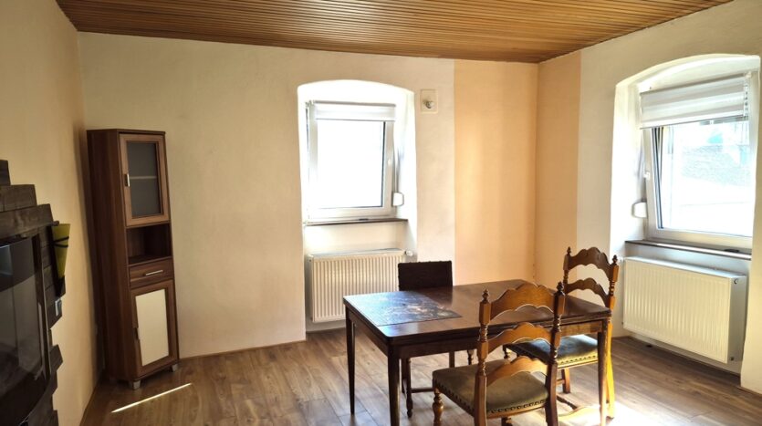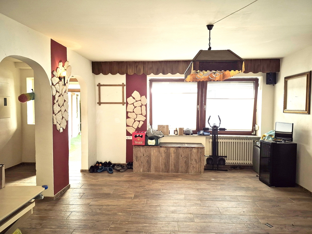 Bei einer Aufteilung in ein Zweifamilienhaus könnten die ehemaligen Gasträume als Schlafzimmer und Küchen-Wohnbereich genutzt werden. So wäre eine Wohneinheit mit Zugang vom Innenhof aus darstellbar.